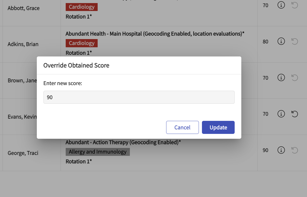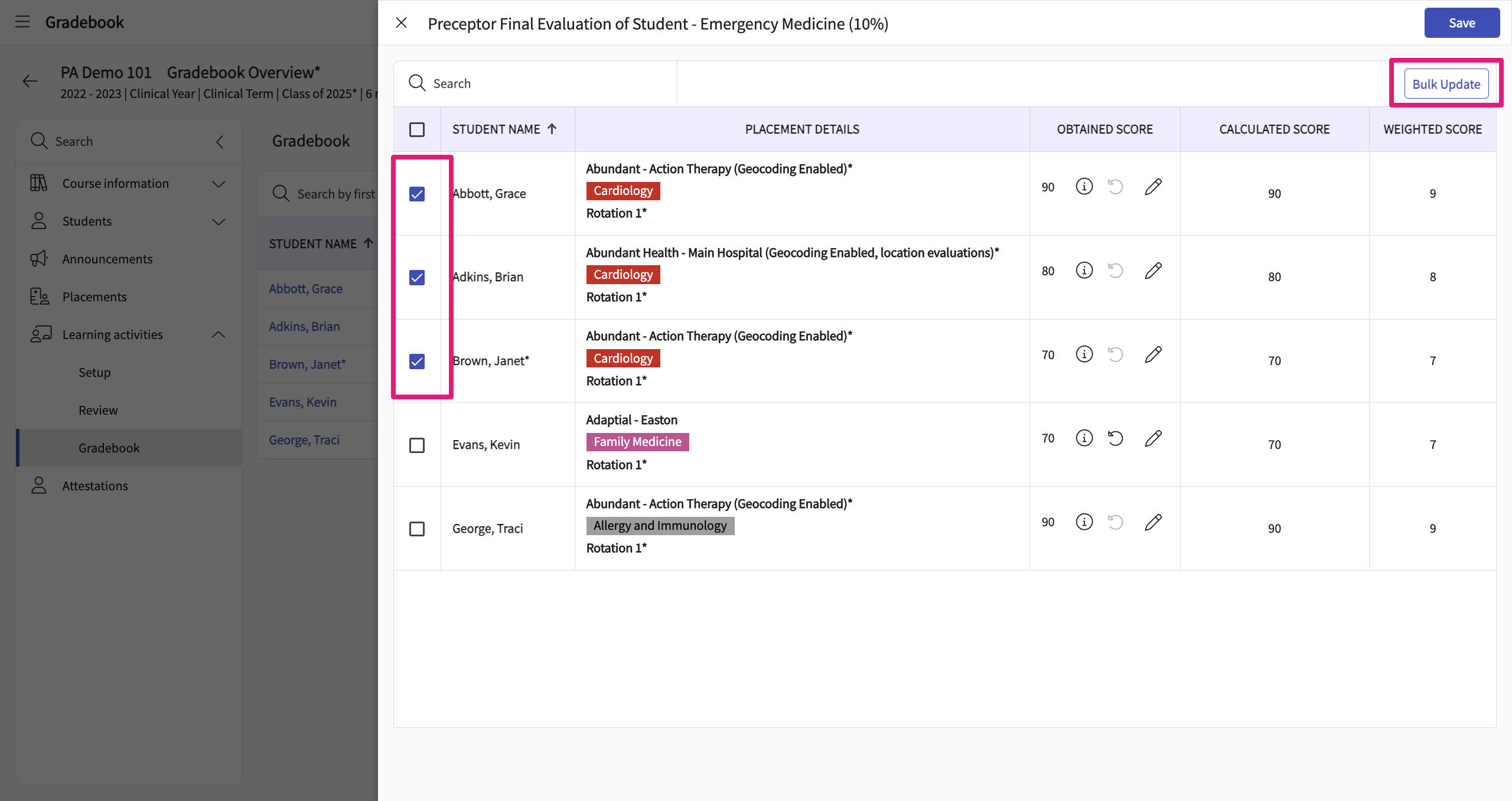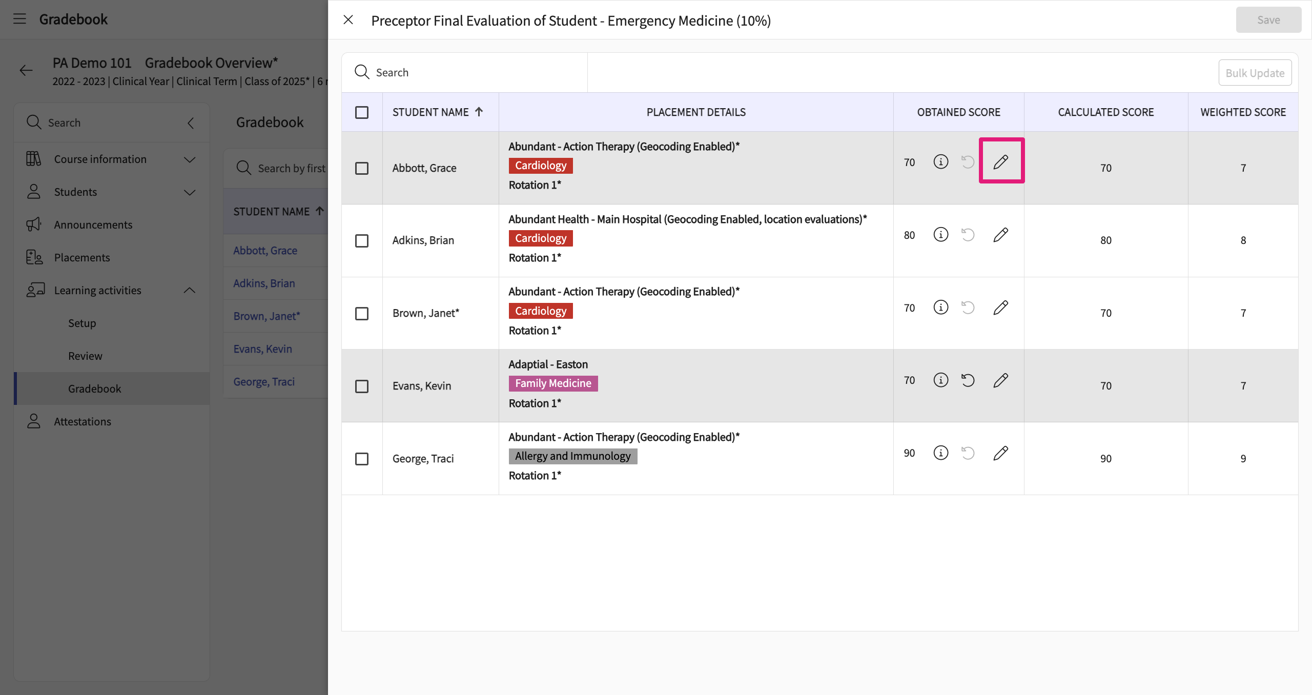 - A drawer will open up you have the ability to enter an update any score of the individual students