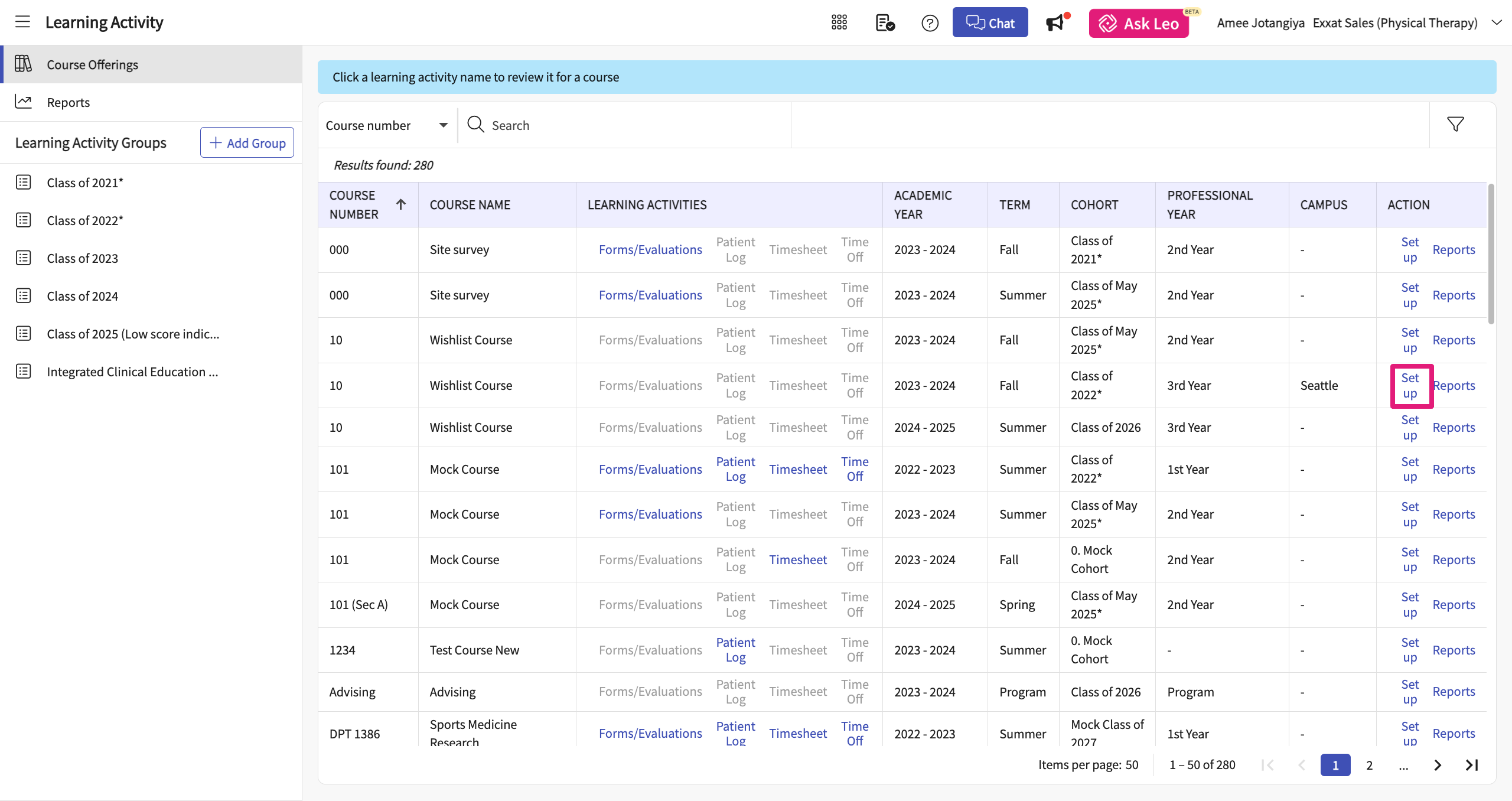 - Click on “Set Up” for the course you want to see the Gradebook view.