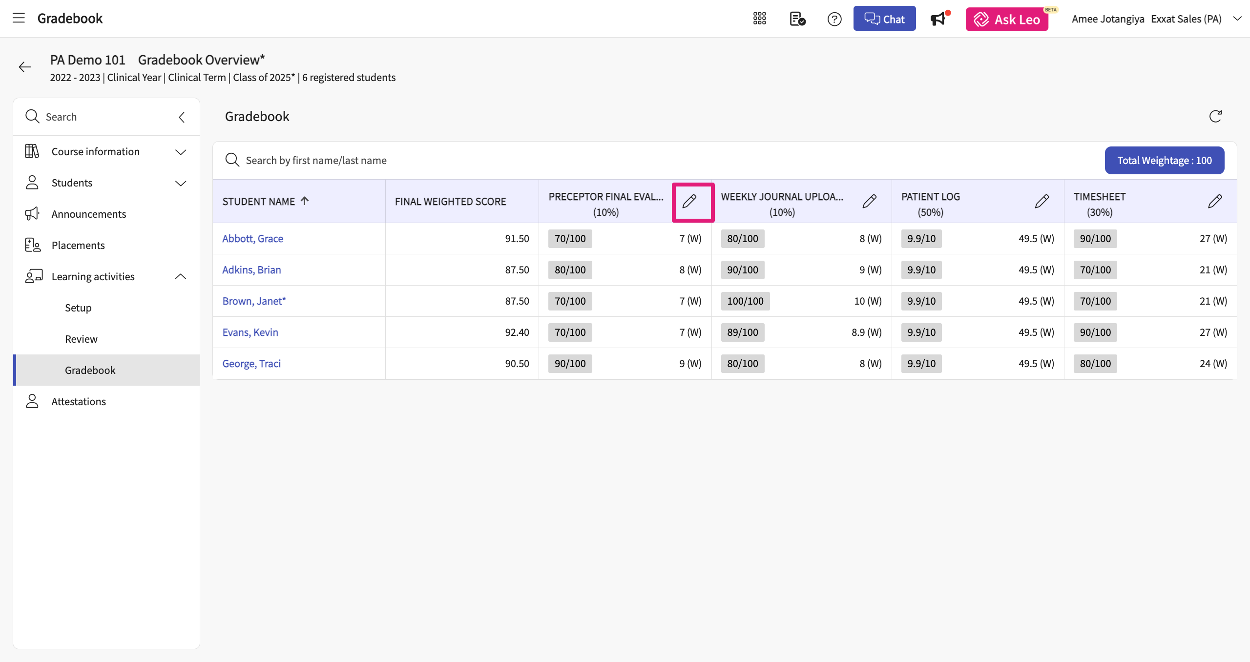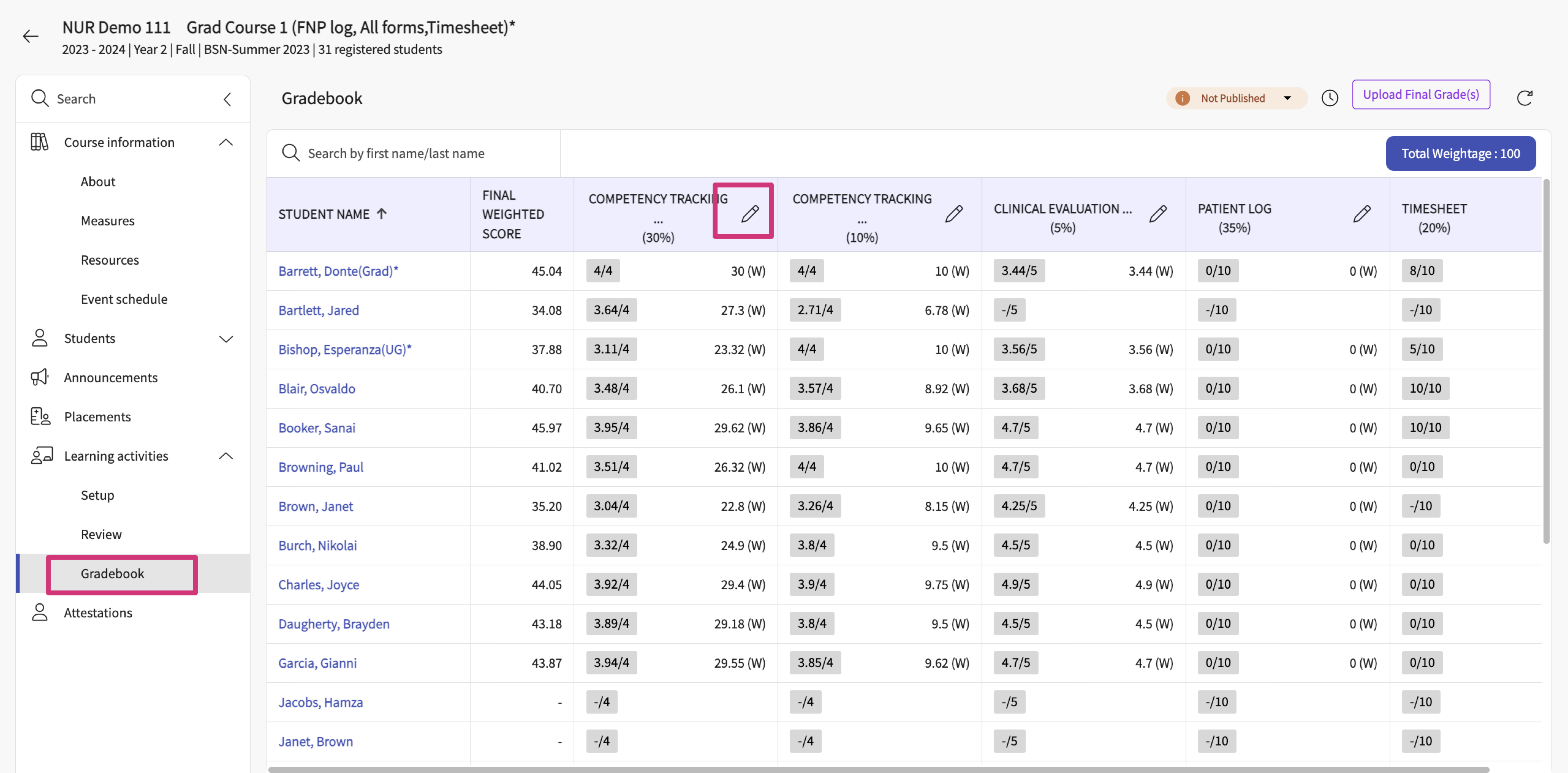 - On the next page click on “Gradebook” under Learning Activities to view the final score of each student across different activities.