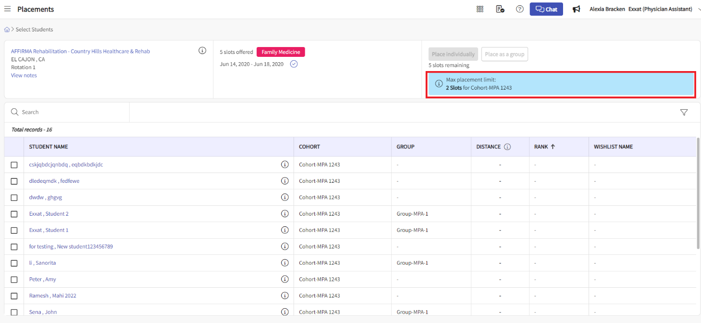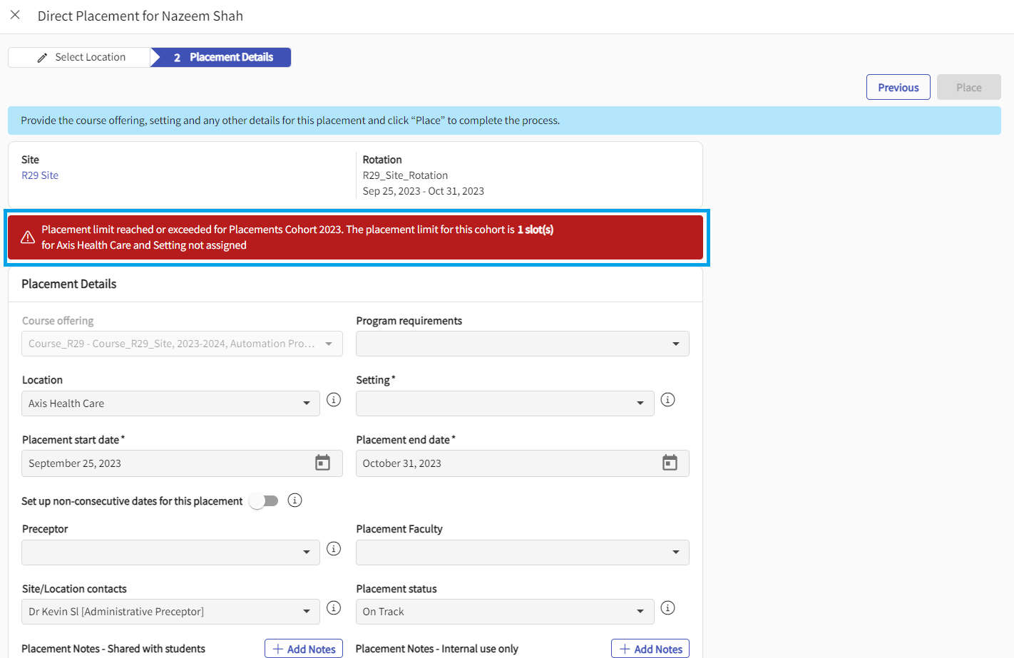 - For a given location and cohort (without assigning setting) if a max limit is assigned, while doing direct placement if max slot limit is reached or exceeded for a given location and