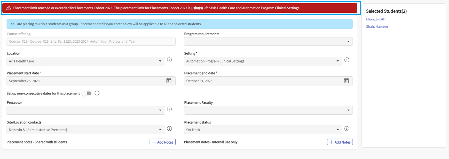 cohort combination after student selection for placement, we will show a warning box above placement cards in Make Placement drawer in “Place As a Group”.In the student view if max slot limit is reached or exceeded for a given location, setting and