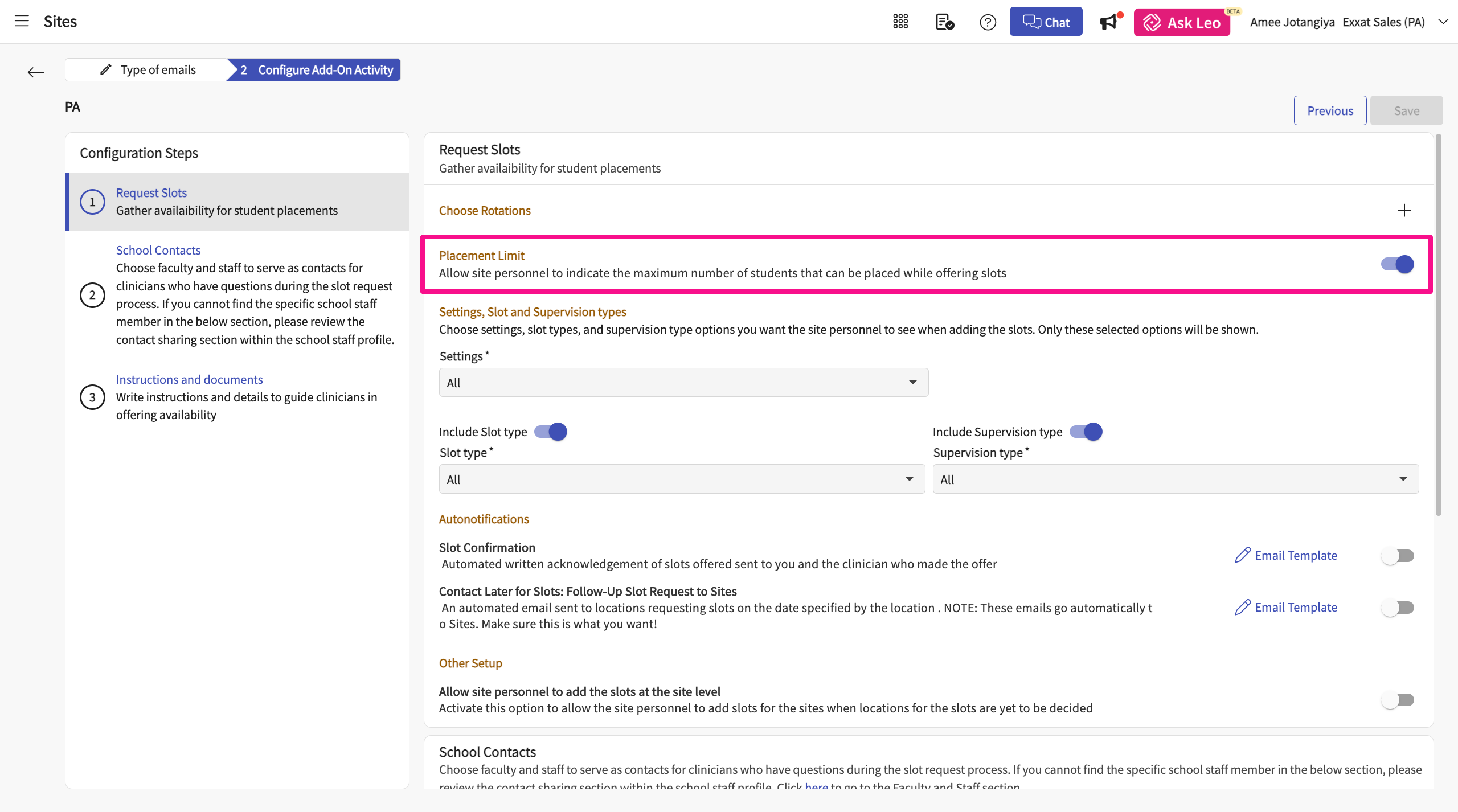 When setting up the slot requests, schools will get an option to enable placement limit functionality in the slot request delegator links to allow the site personnel to add the limit against the slots they offer. If disabled, the limit option is not shown at all.