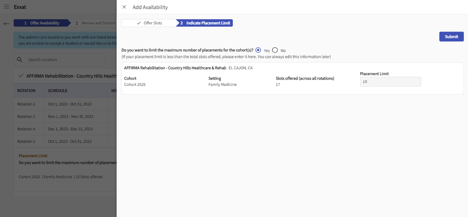 Admins can also add the limit when offering slots, just like site personnel on the delegator side. The flow is same, they can see the option to add the limit while offering the slot (the second step in the slot offering drawer). If the limit exists already for that location, cohort and setting option, that will be shown. Else users can add the new number.