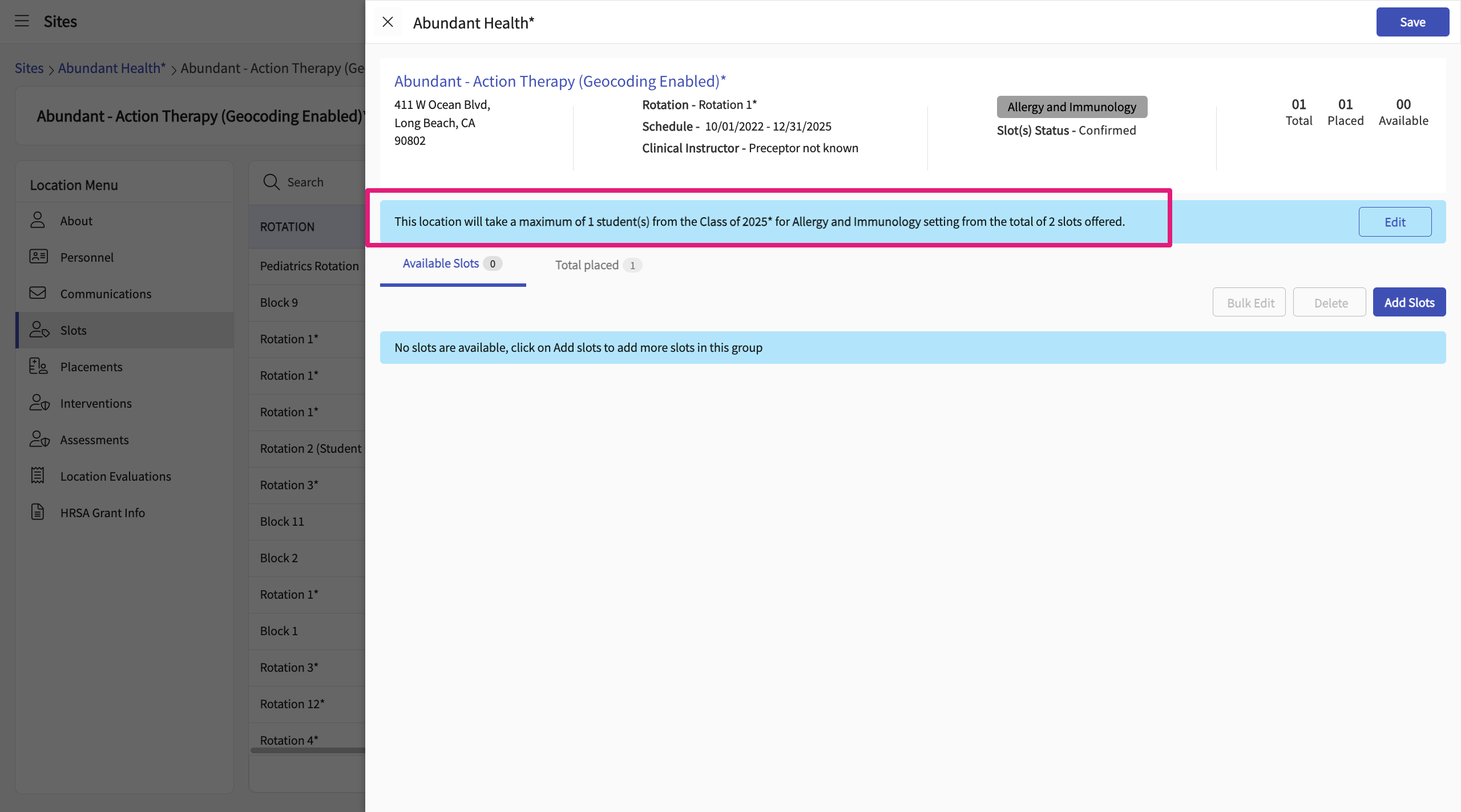 Each row in the Slots List View does not represent a unique combination of Location, Cohort, and Setting, even though slot limits are configured based on these combinations. Instead, you may see multiple rows with the same Location, Cohort, and Setting, but differing in other parameters, such as rotations, preceptors, etc.