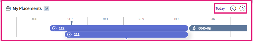 Calendar View: Displays placements in the calendar view. The calendar highlights the current date and if there are more than one placement, then you can navigate between placements using arrows. The details are updated according to the placement displayed in the calendar. Following are the tags displayed based on the status of the placement: