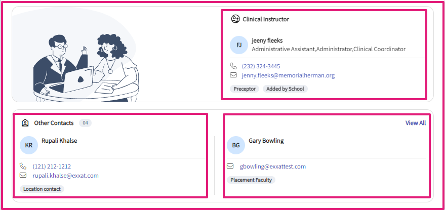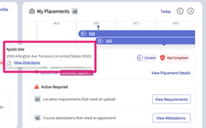 Current and completed Placement: Includes course offering name, blue tag, compliance status, location, rotation details, clinical instructor, patient logs, and timesheet information. You can view the following options if your university admin has configured it for you: