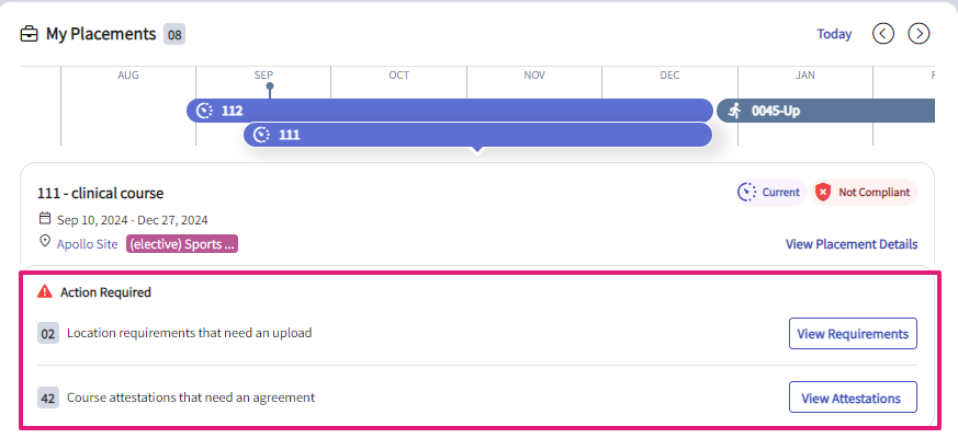 Action Required: Displays the attestations and requirements information required for you to submit for your placement. Click View Requirements or View Attestations to agree and review the attestations.
