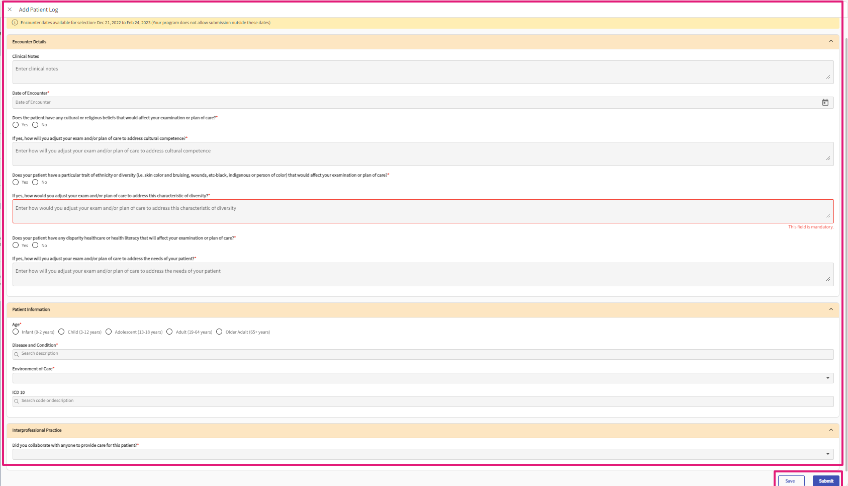 - In the Add Patient Log drawer, click Save, Submit or Download as PDF as required.