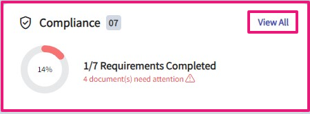 Compliance: Displays the total number of documents approved versus the total assigned. Click the View All to access the Compliance section in a new tab.