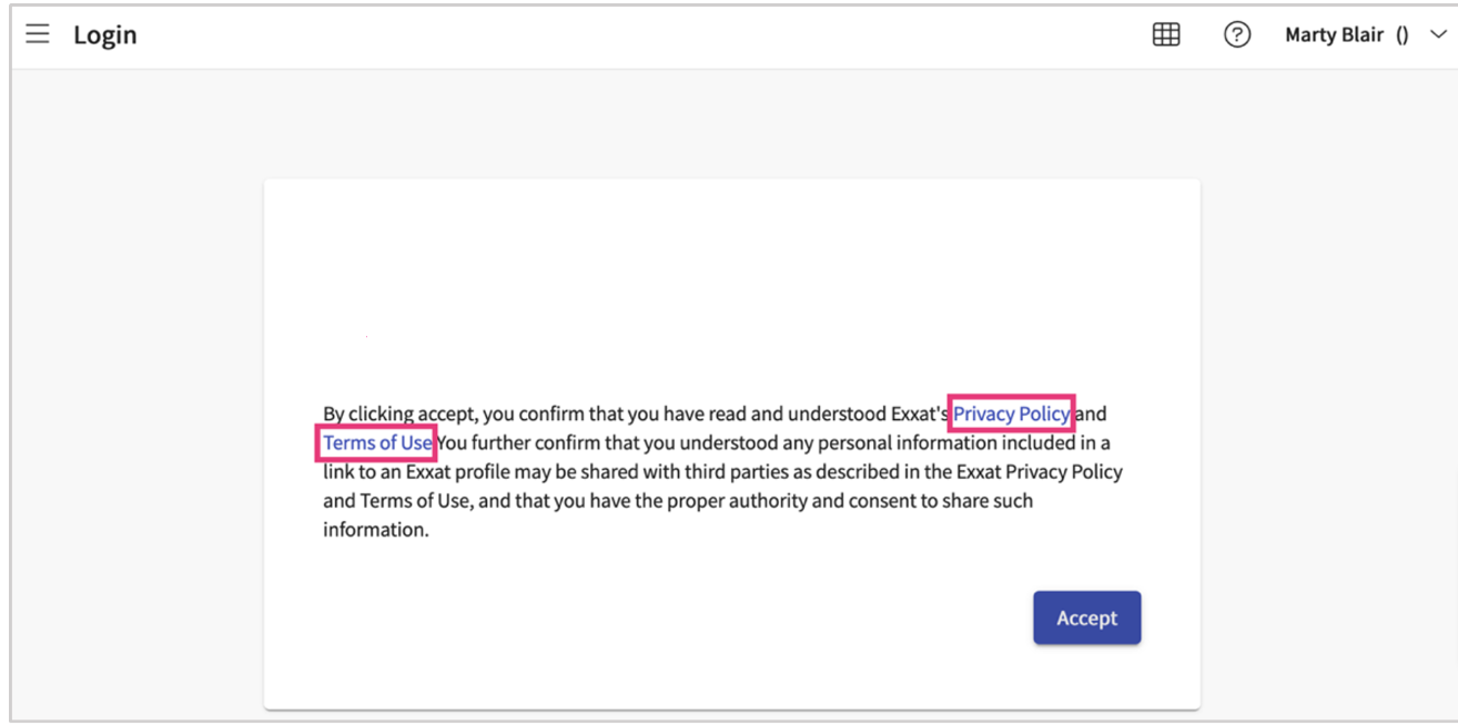 - Before you can login, you must agree to Exxat’s Privacy Policy and Terms of Use. Click Accept when ready.