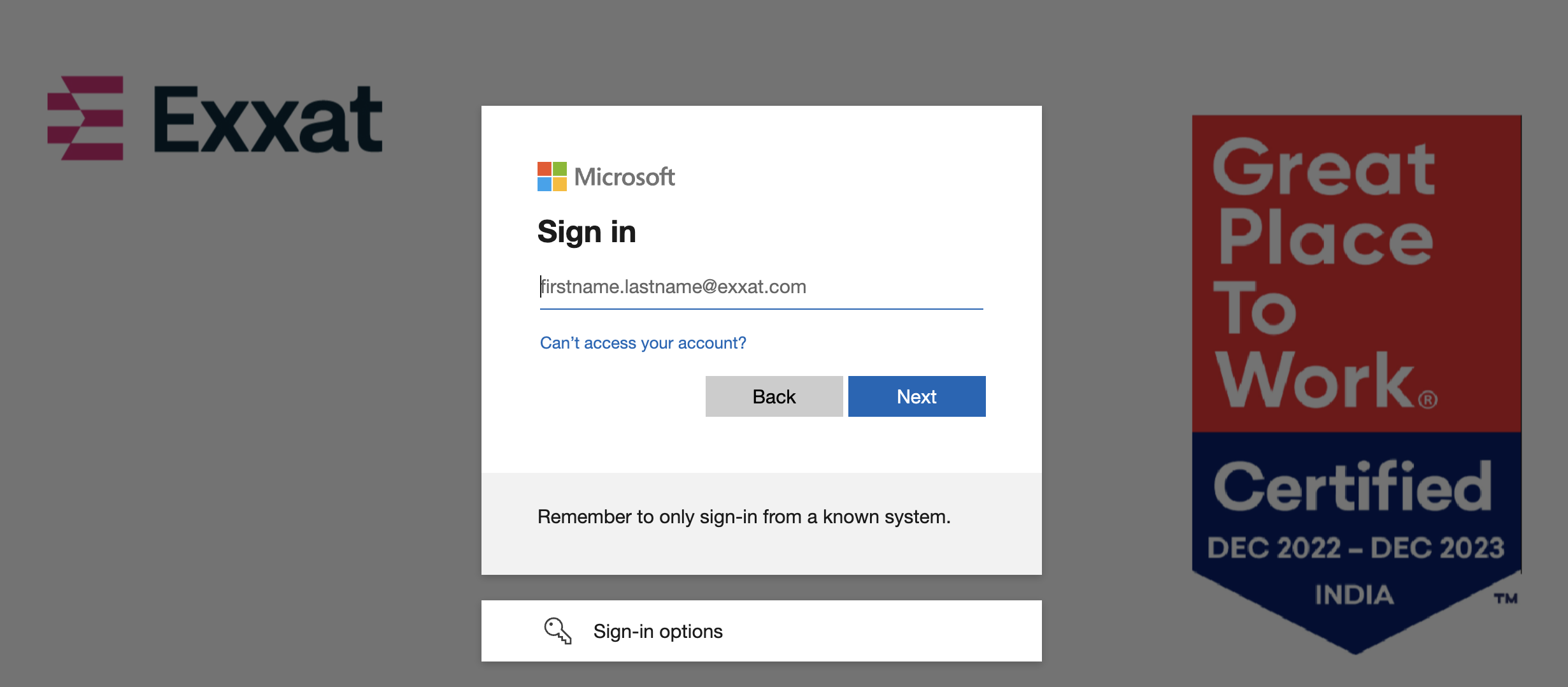 4. You can now login to your account! Head on over to exxat.com and enter the email address for which you received the invitation, along with your password. Then click on the next button.