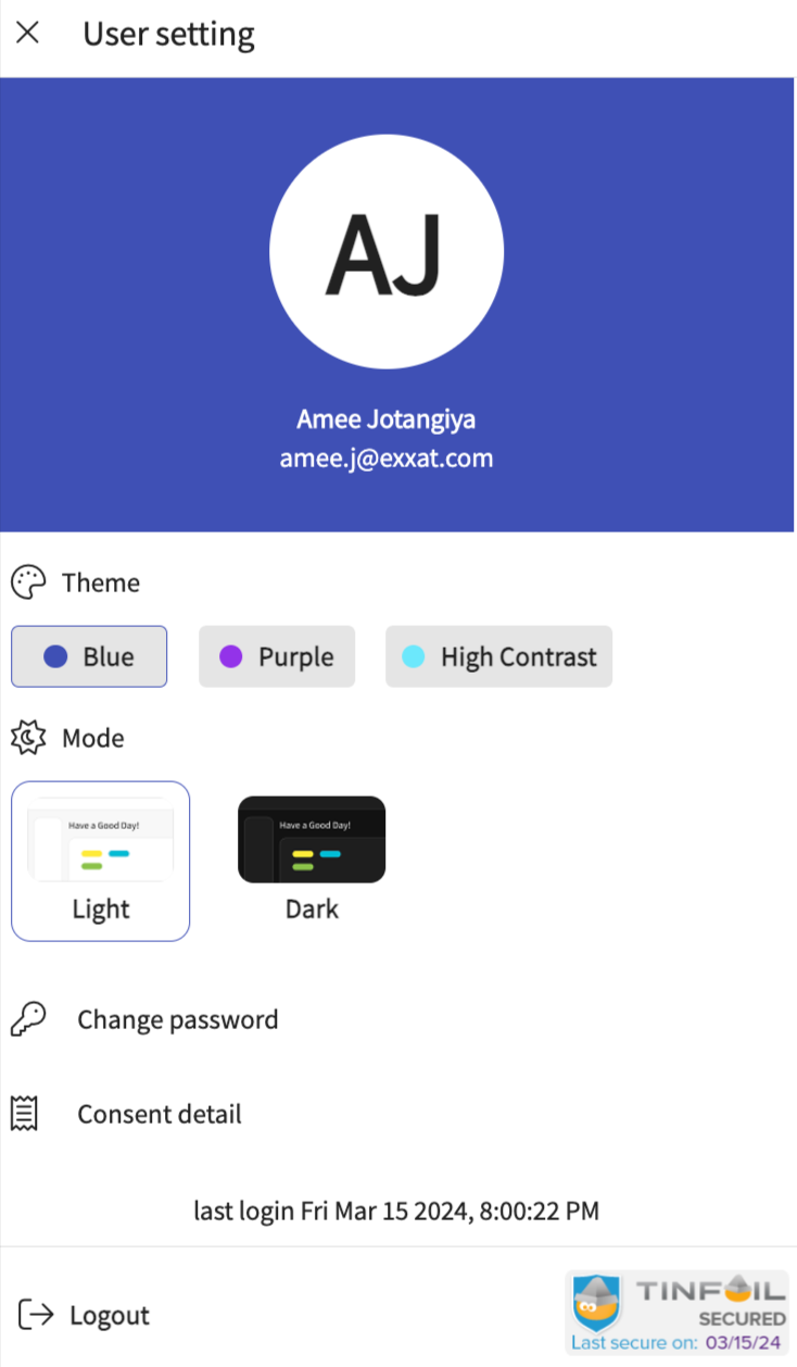 8. To change the theme, accessibility mode, or change your password, click the dropdown arrow next to your name.