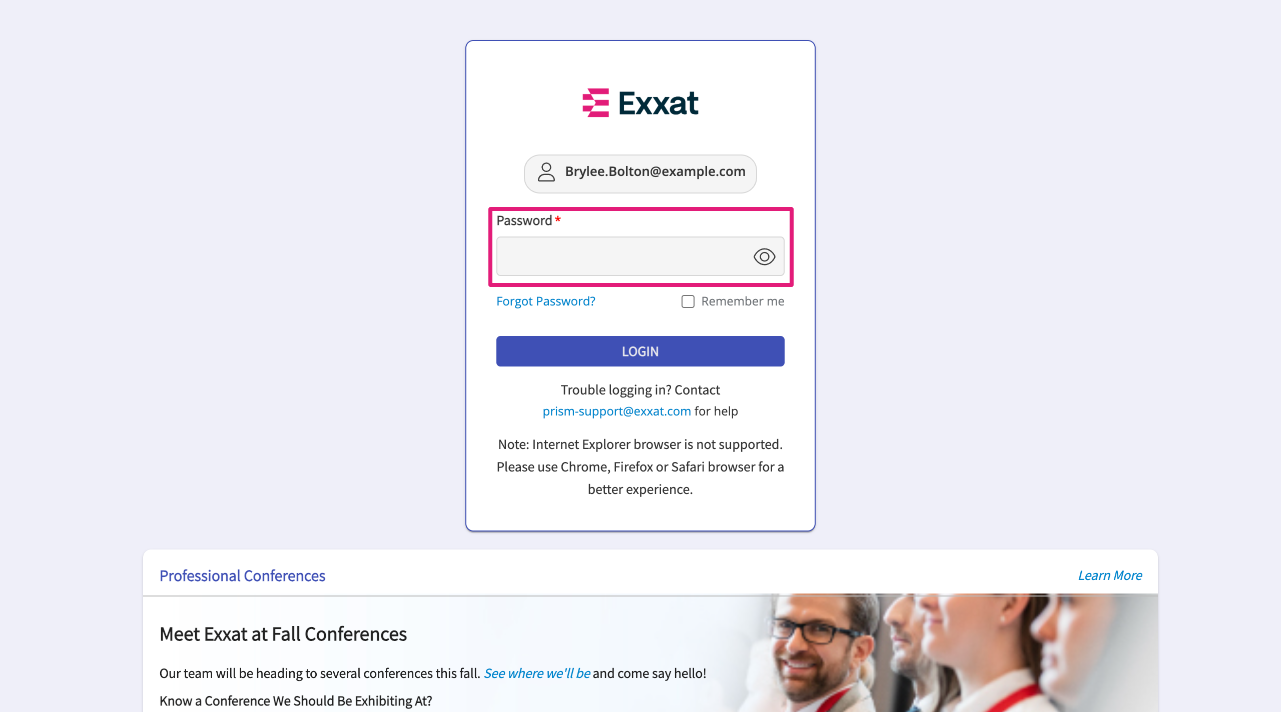 If you've forgotten your Exxat Prism password, please click on the "Forgot Password" link.