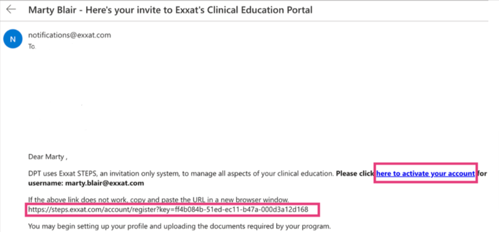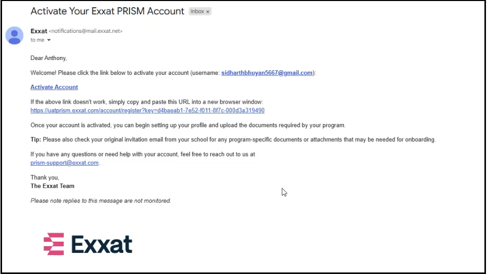 1. You will receive an email from notifications@exxat.com in your inbox.