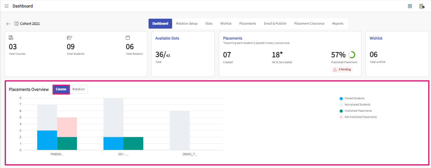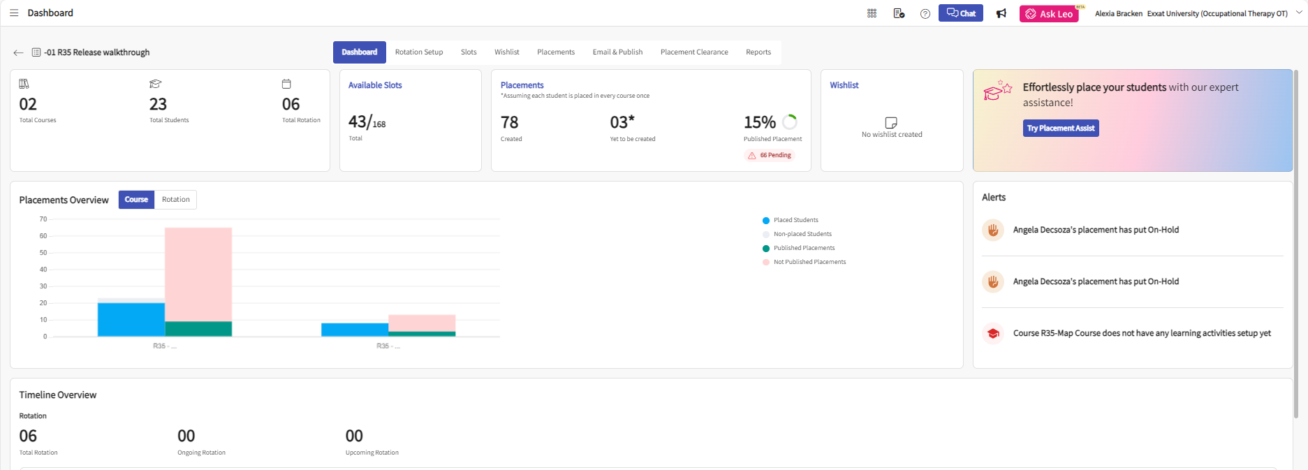Placement dashboard provides a comprehensive summary of all placement group/course offering statistics, allowing for easy assessment of placement scope and readiness. It graphically visualizes the number of placed and unplaced students, as well as published and unpublished placements, through course and rotation views. Users can view rotation timelines in a calendar format, offering both summarized and detailed insights. Built-in navigation ensures seamless access to individual placement pages for more detailed management.