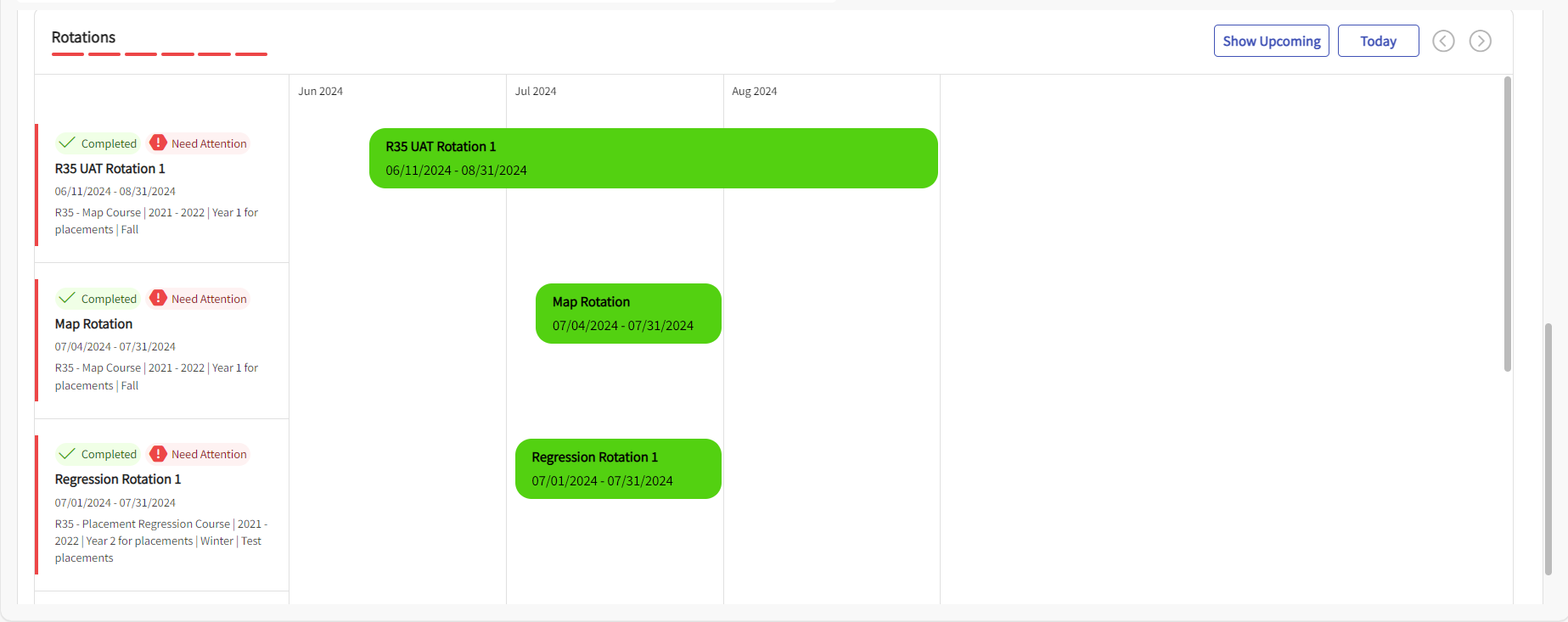 Timeline Overview: Explore the timeline of rotations in a calendar view, offering both summarized and detailed information for each rotation. If a rotation needs any attention, then the rotation information card is displayed in red. In the Rotations section, you can explore the following: