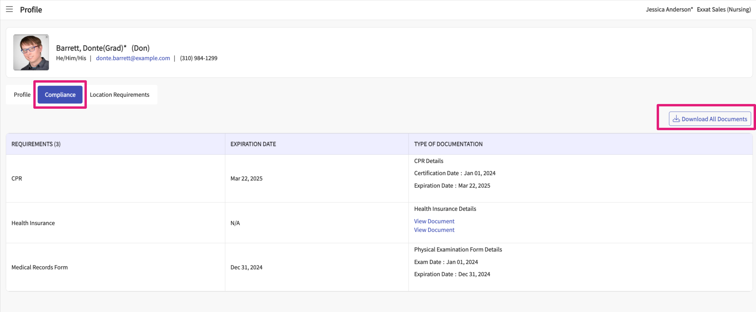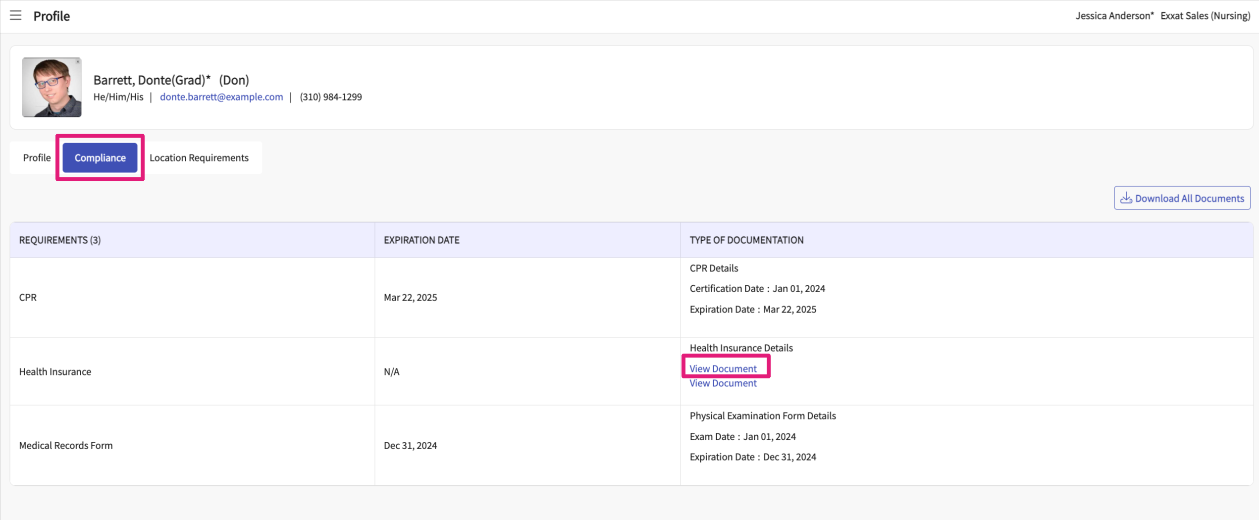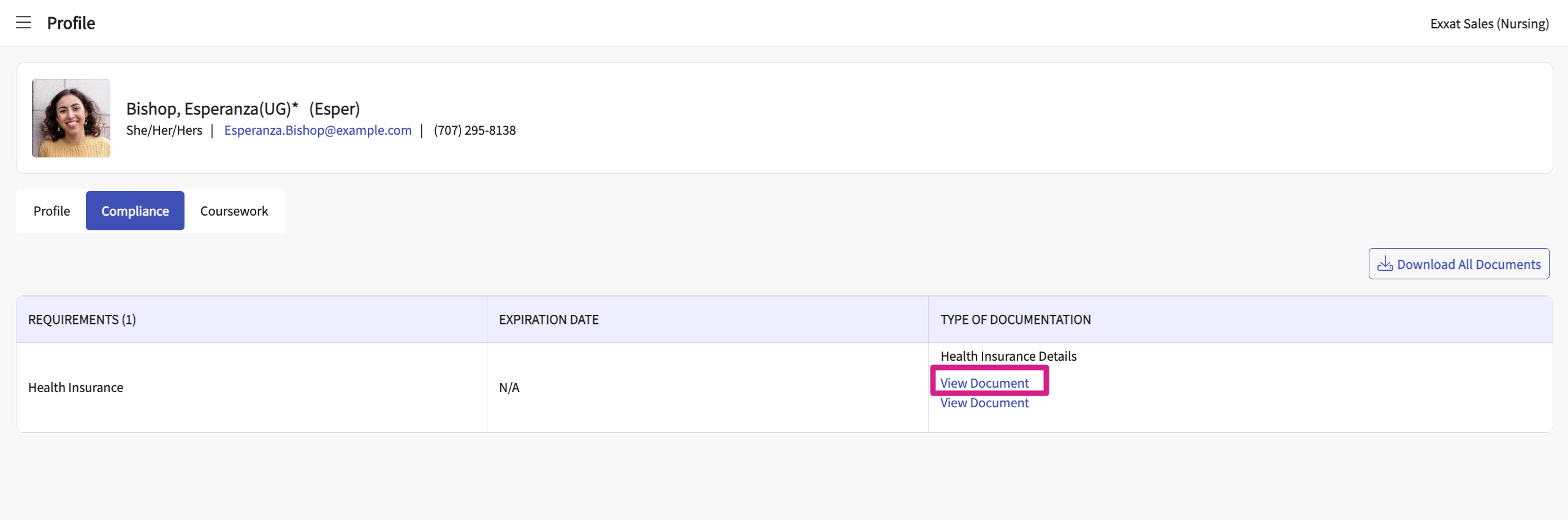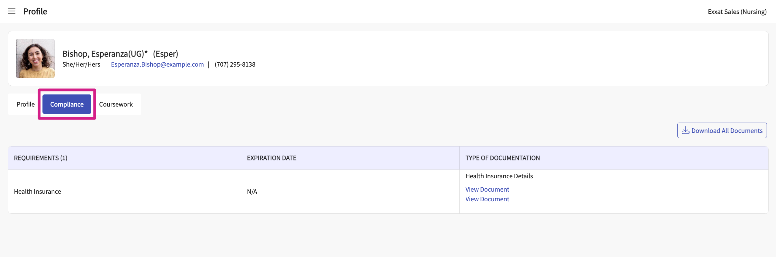 Compliance Information: To view the student’s compliance documents (e.g., certifications, background checks, medical records):