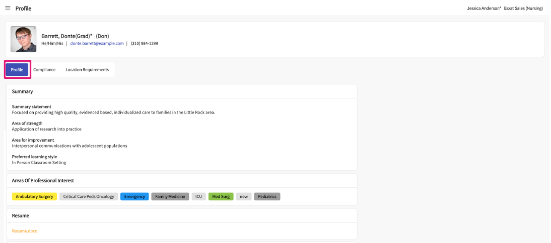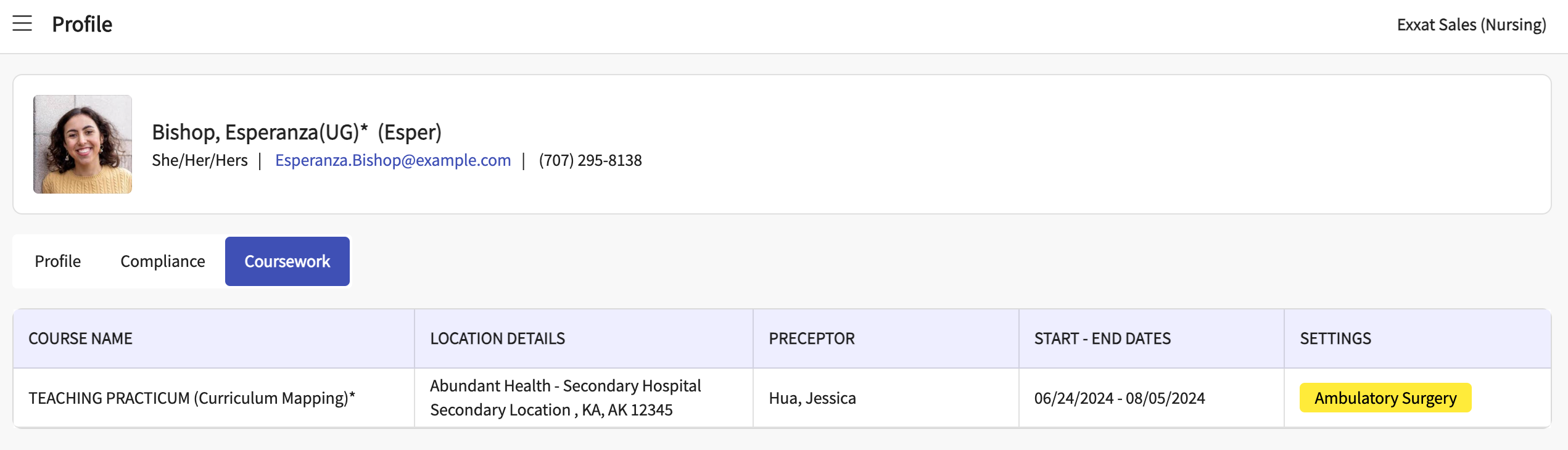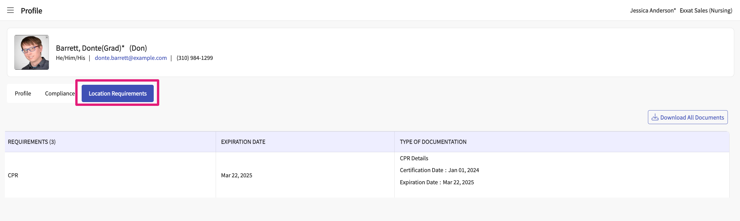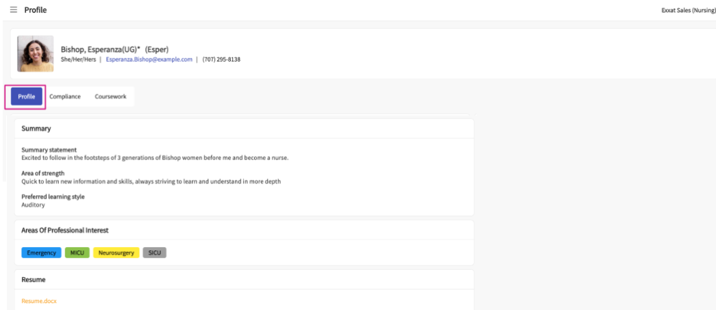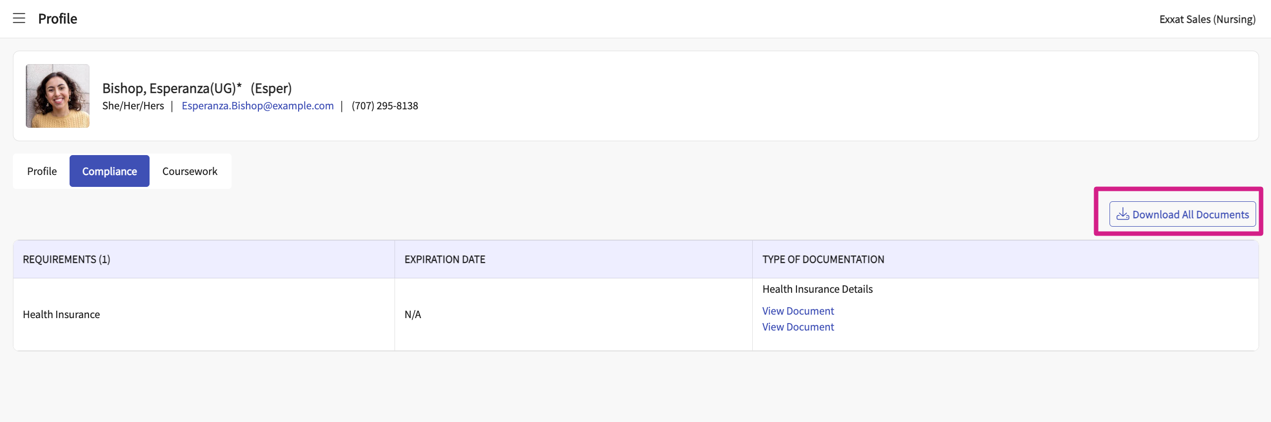 Compliance Information: To view the student’s compliance documents (e.g., certifications, background checks, medical records):