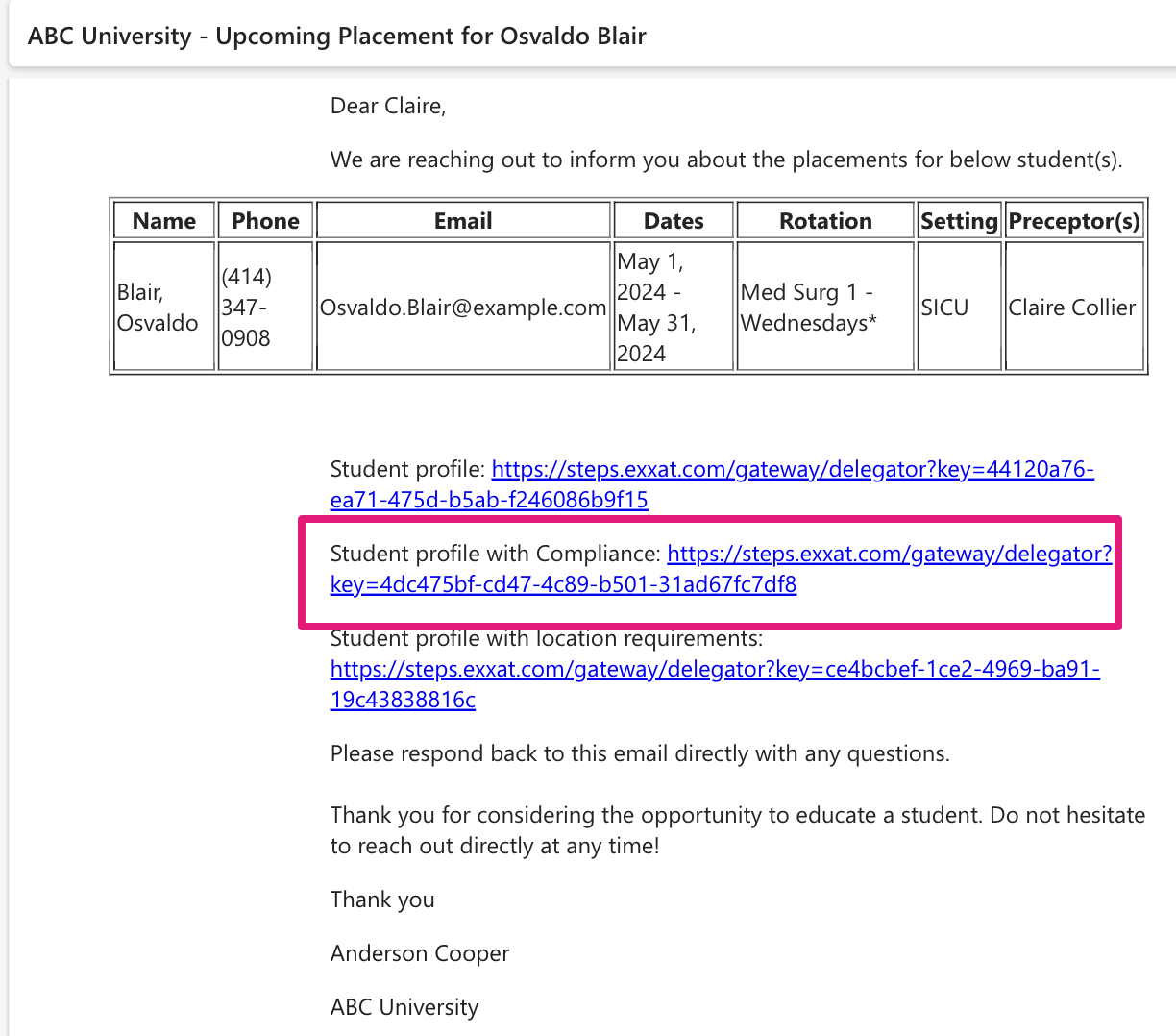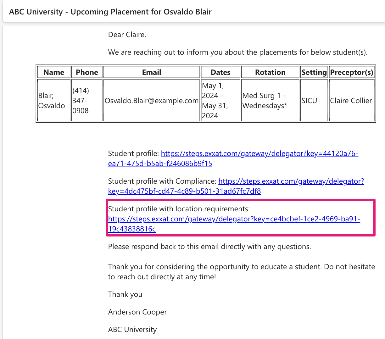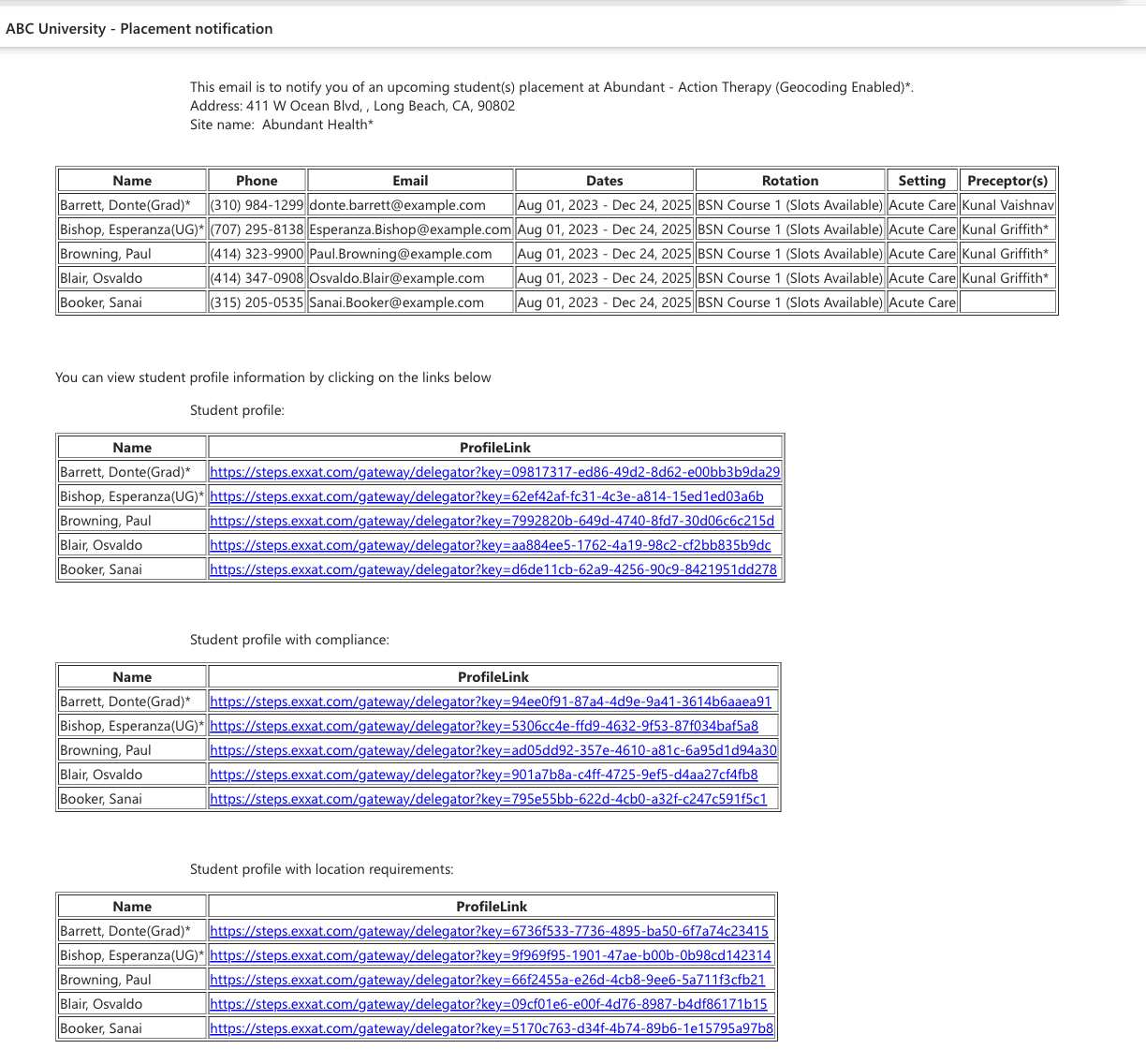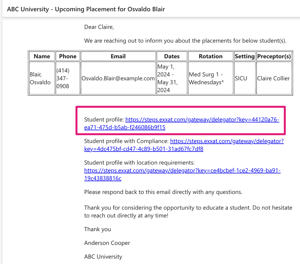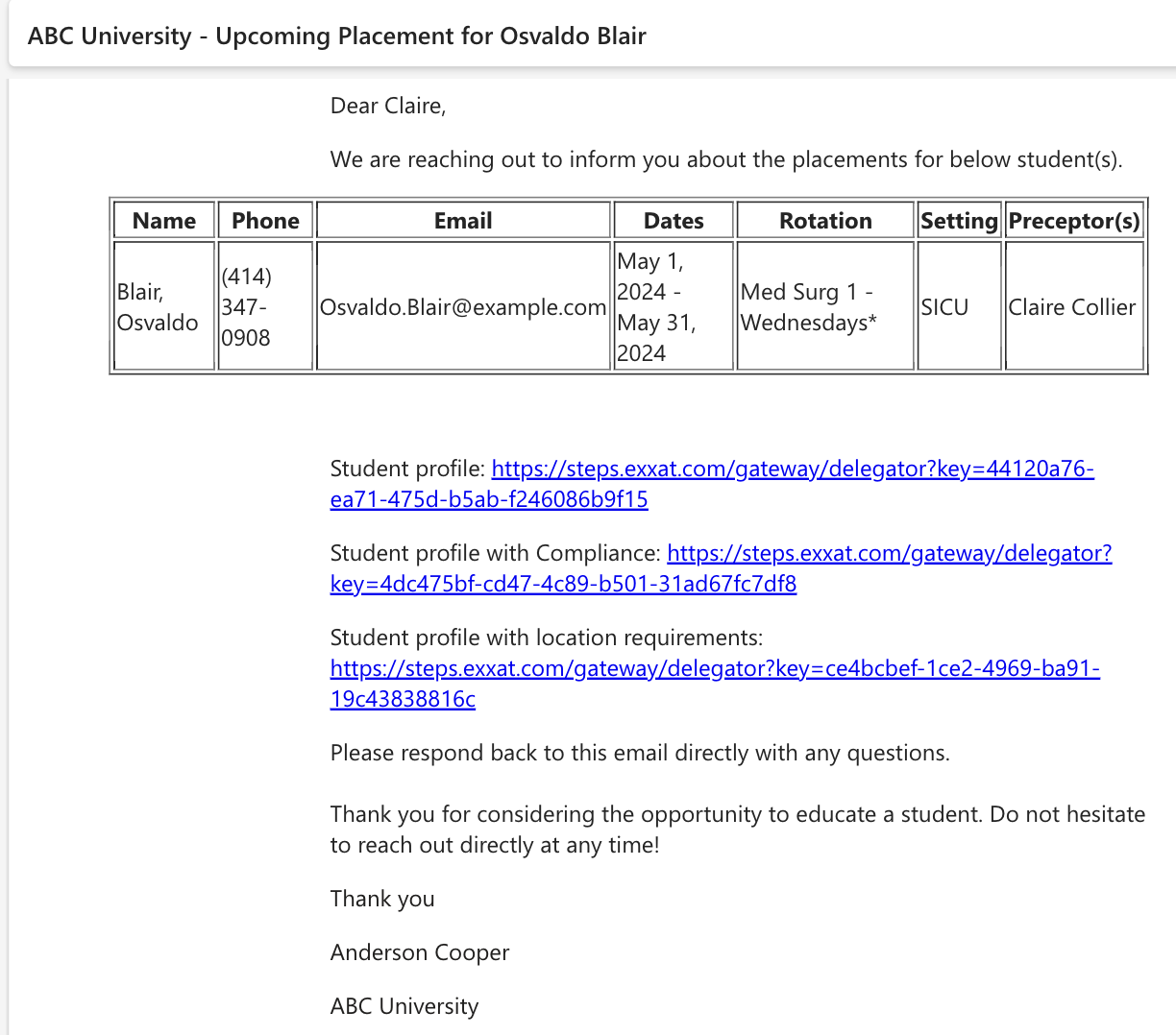 When a student's placement is confirmed with your site, you will receive a notification from the program administrator containing all the essential details about the student's placement.