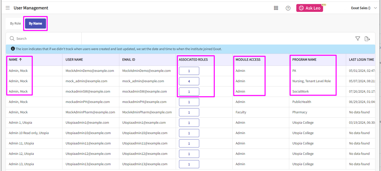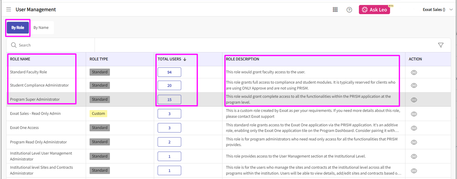 5. In the "By Name" section you can see all the users with the program name, roles assigned to them, & how many roles are assigned to each user.