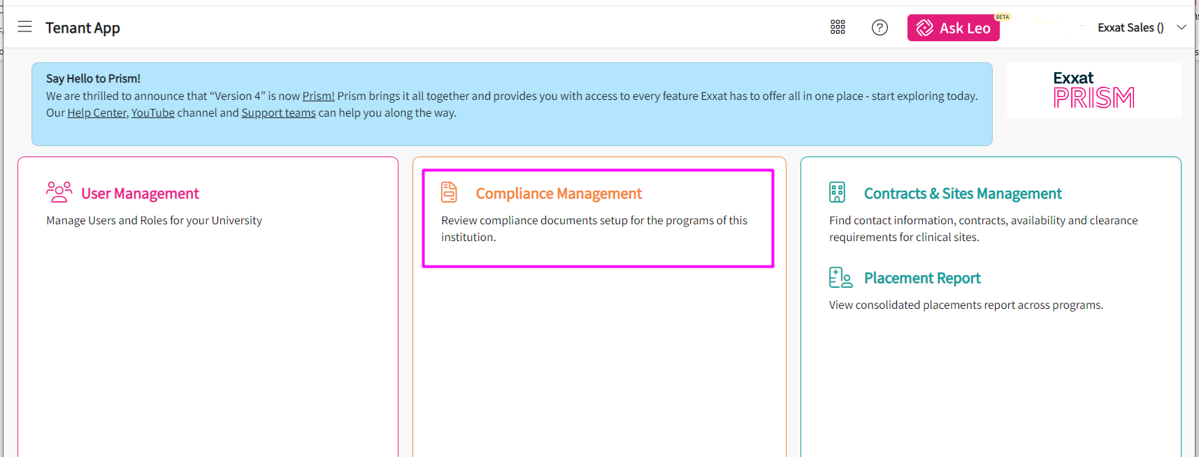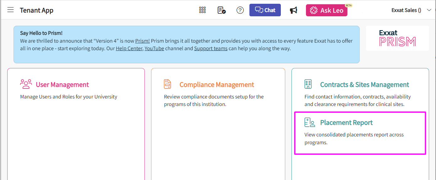Institutional Level Access enables administrators to manage users, ensure compliance, get placement reporting and manage sites and contracts across multiple programs in your institution, – its a all in one centralized access. To activate this powerful administrative access, contact prism-support@exxat.com or connect with your dedicated Account Manager.