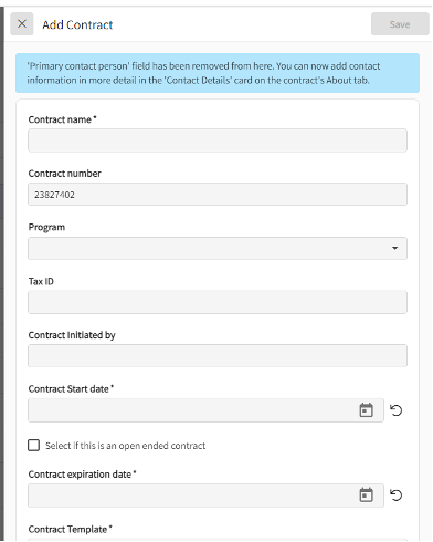 21. Click on Add Contract on the right side of your screen. A drawer pops up where you can fill out the contract details define the program you want to share the contract with and click on save once done.