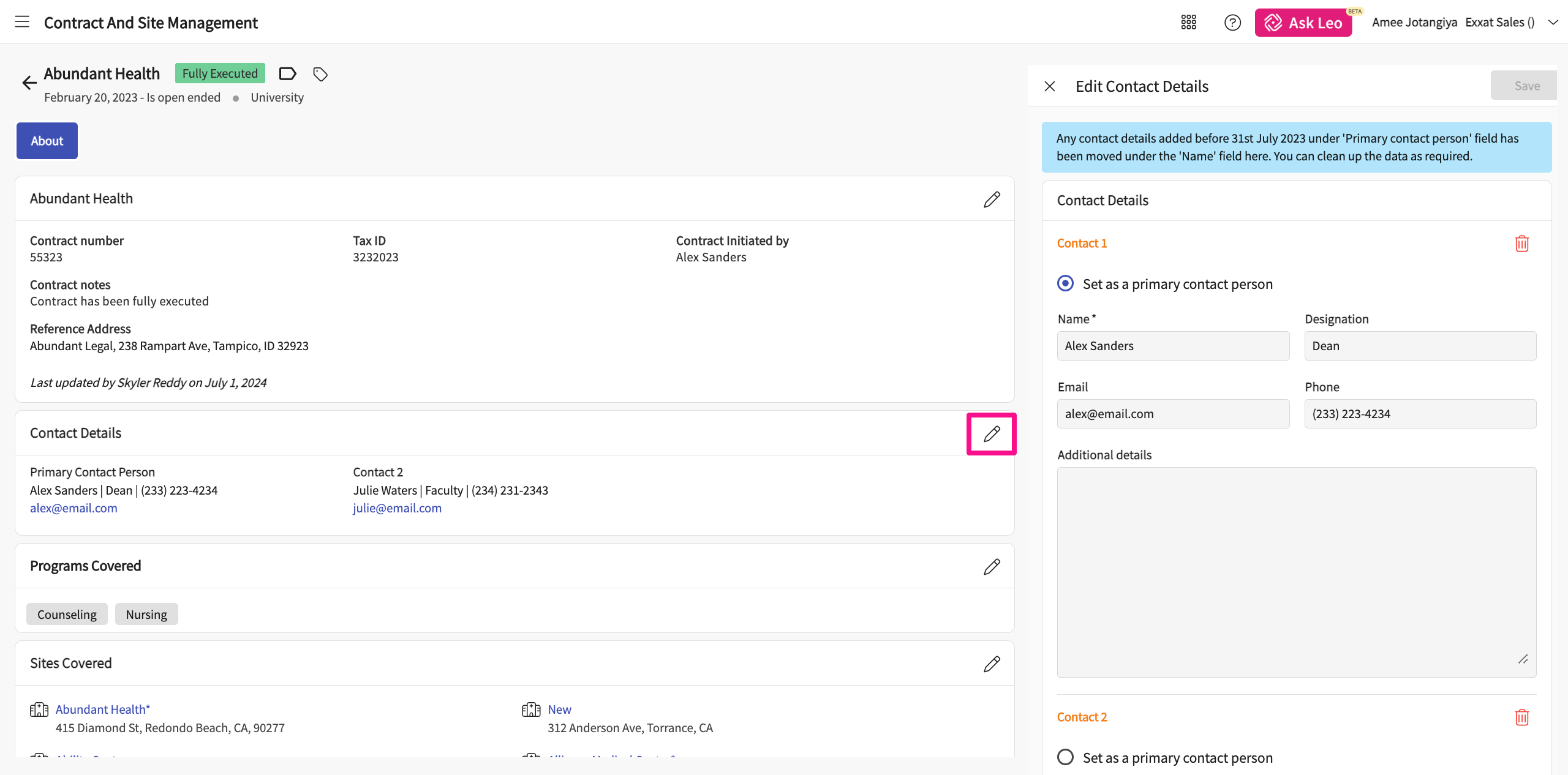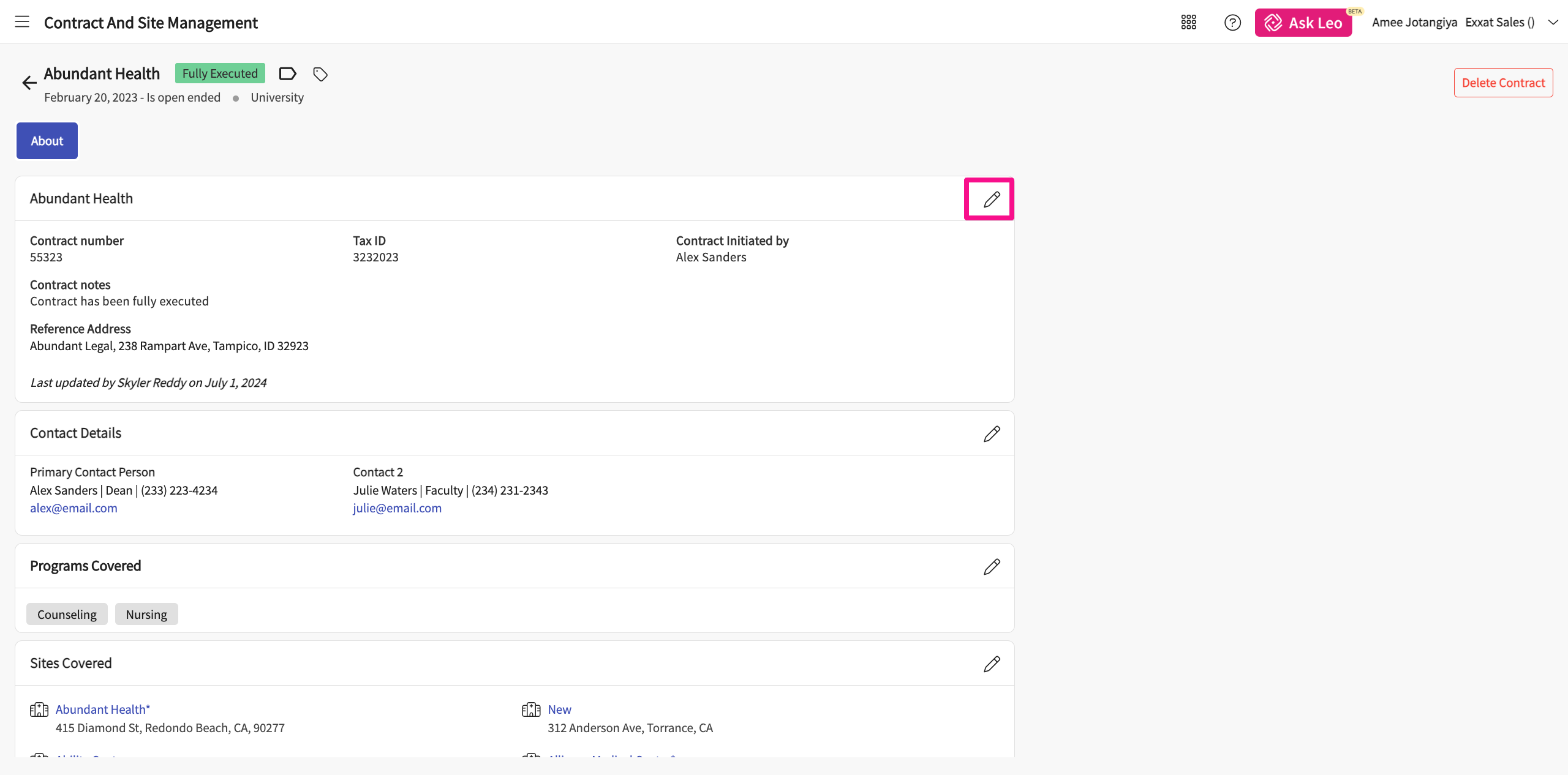 Click on the pencil icon to edit the basic information for the contract.