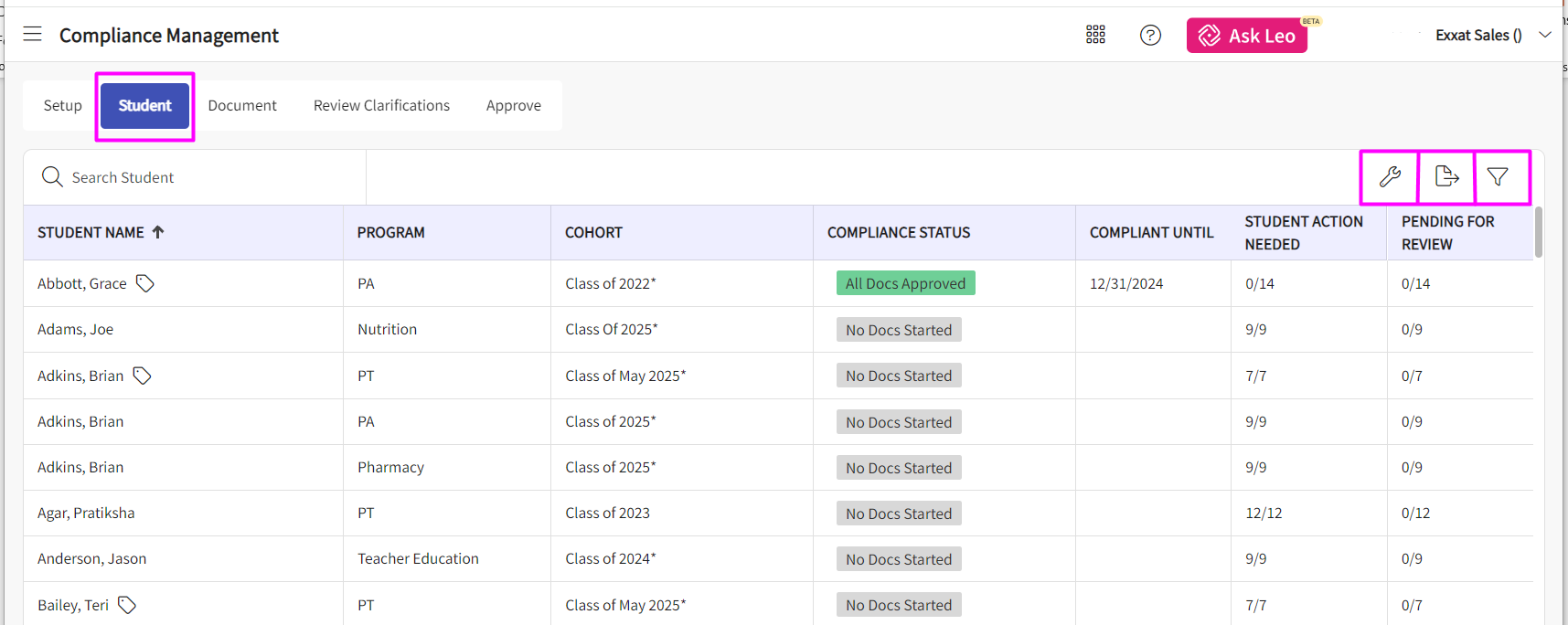 10. You will see a list of all students with the program names & the cohort information. On this page you will also see the current status for all compliance items of each student. You can also click on the funnel icon to filter results, the wrench icon to rearrange the columns or Export to download the same on an excel spreadsheet.