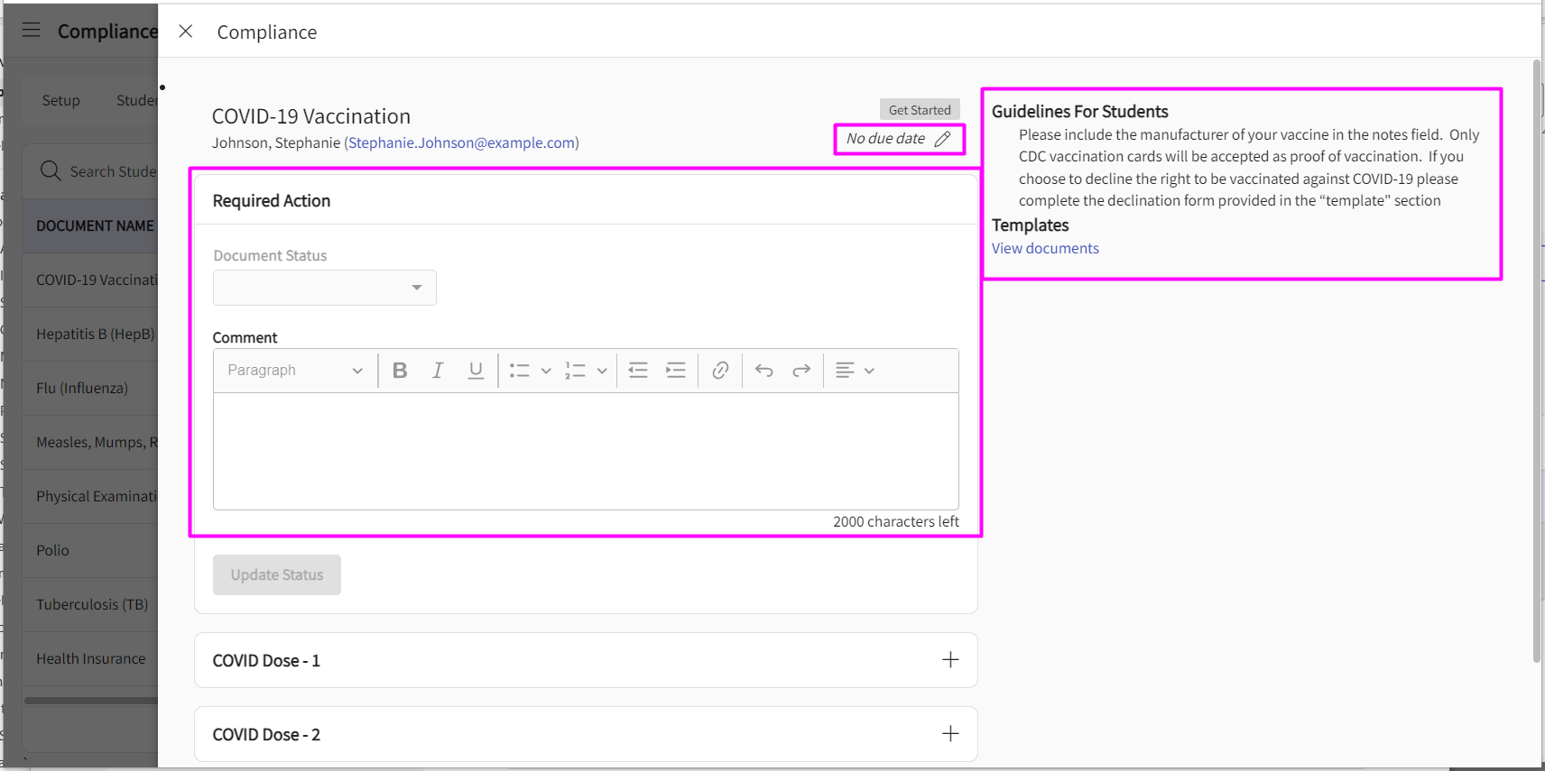 14. The "Document" Tab shows the Compliance document name & the document Status for individual students in each program and the cohort. You will also see the document due date, expiration date & follow up date (if any).