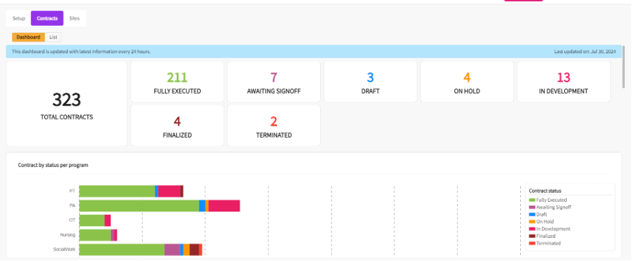 19. You can see all sites and contracts across all your programs. A dashboard shows up with a summary of all contracts, and their status spread across all programs. You can switch to the list view from here.