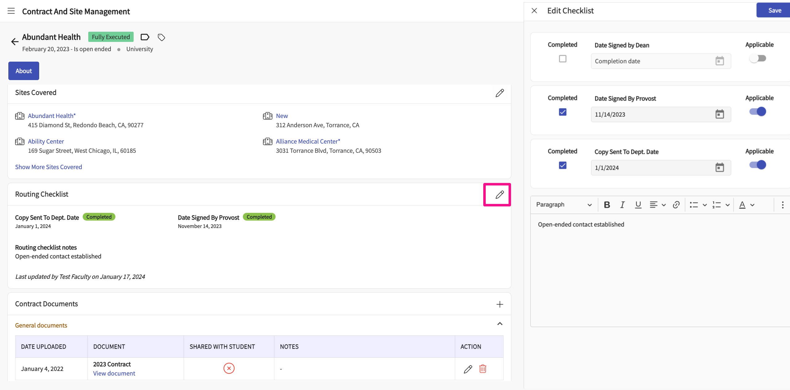 26. Click on the pencil icon to edit the information about which sites are covered under a contract.