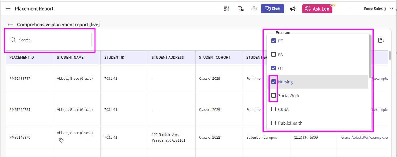 33. Click on "Placement Report" to get a consolidated overview of placements across all your programs. A page would open as "Comprehensive placement report [live]" where you will need to select the program from the dropdown or you can also search for a specific placement using the "Student Name", "Placement ID", "Student ID", "Cohort Name", etc.