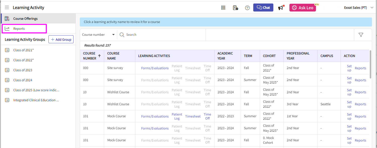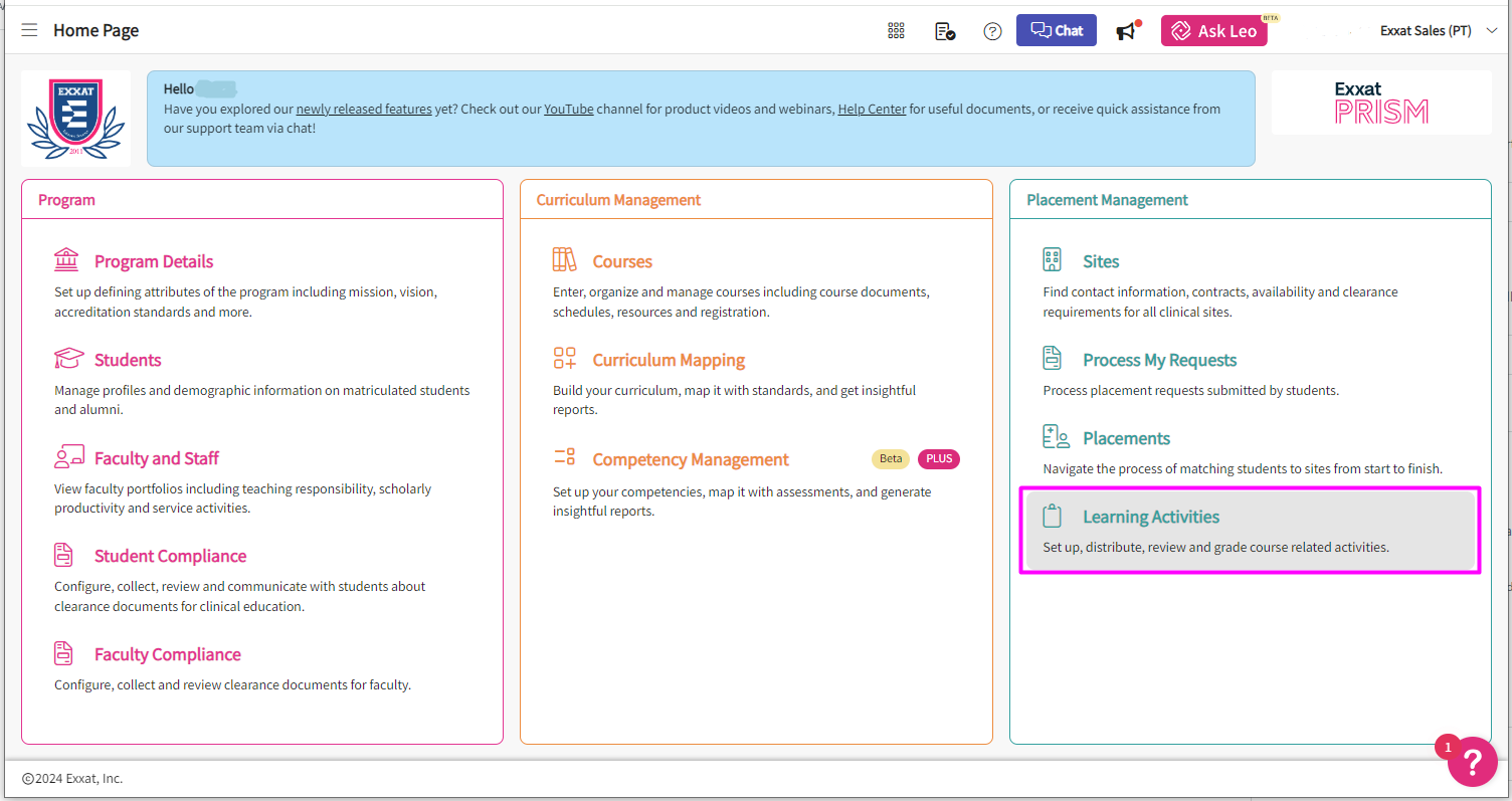 1. To access the PTSE Report, select Learning Activities from your left-hand menu or the dashboard.