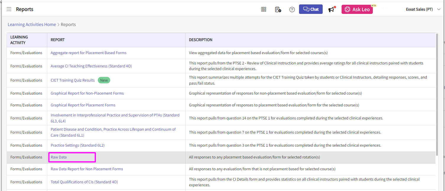 3. A list of all available reports would be displayed, you can then click on 'Raw Data' for Forms/Evaluations.
