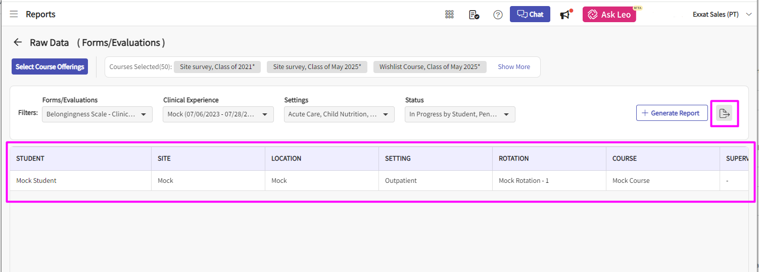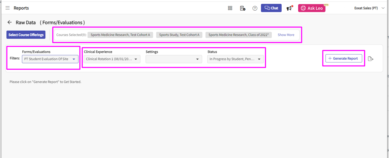 6. After selecting the course offerings, the page will show you a list of all the selected courses. In the Filter options you will first select the Form/Evaluation as 'PT Student Evaluation' if you wish to get more granular results, you can apply the filters for 'Clinical Experience, Settings or Status'. Once the selections have been made you can click on the 'Generate Report' button.
