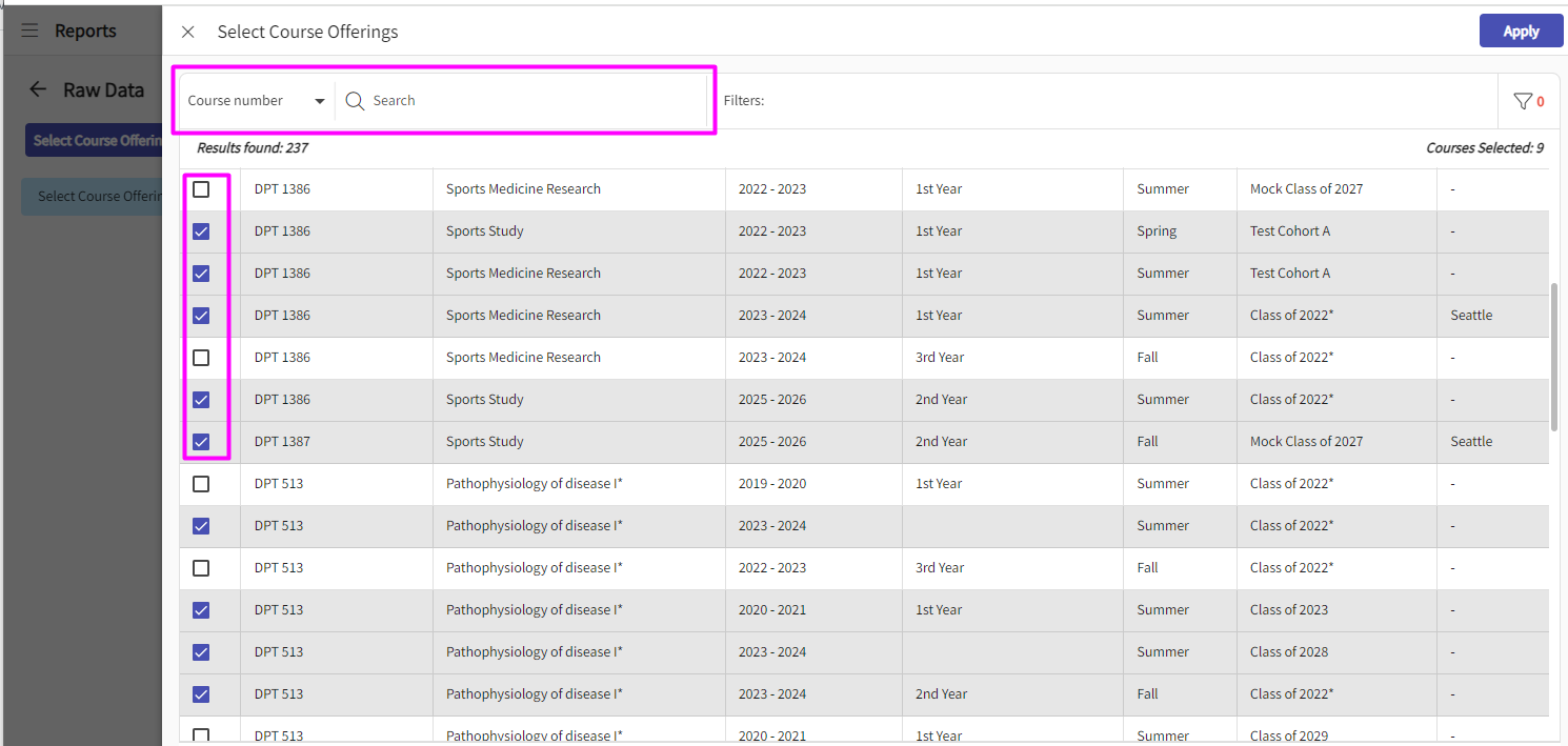 5. A new drawer would open where you will see all the course offerings in your program. You can select multiple course offerings from the list, or you can even search for a specific course based on Course Number, Course Name, Academic Year, Professional Year, Term, Cohort & Campus.