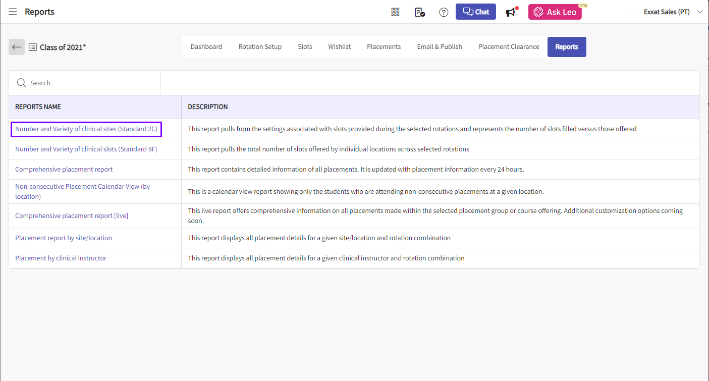 3. On the next page click on 'Reports' from the top tab and click on the report name 'Number and Variety of clinical sites (Standard 2C)'