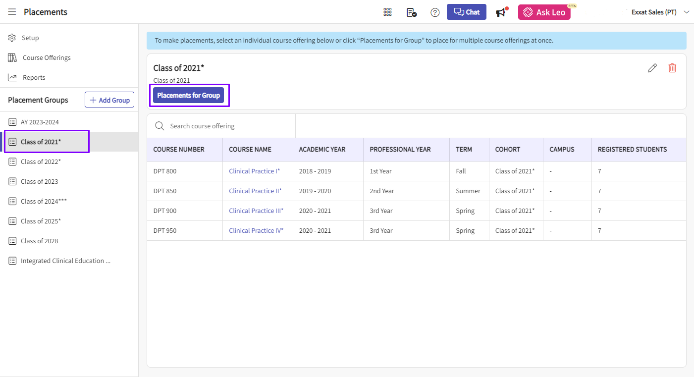2. In the 'Placement Page' page, select the group and click on 'Placements for Group'.