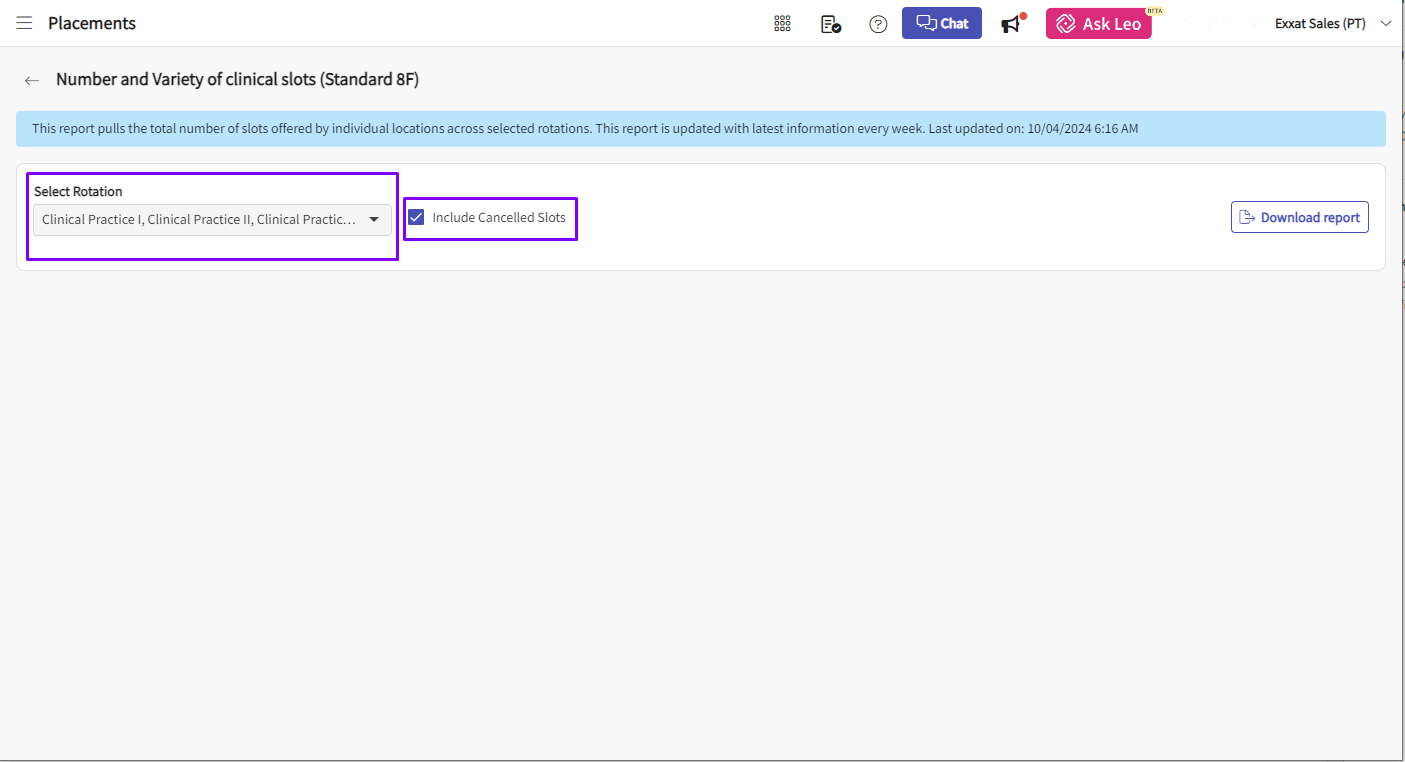4. After clicking the report name, select the Rotation from the dropdown, you can choose to include the Cancelled slots by checking the box and click 'Download Report'