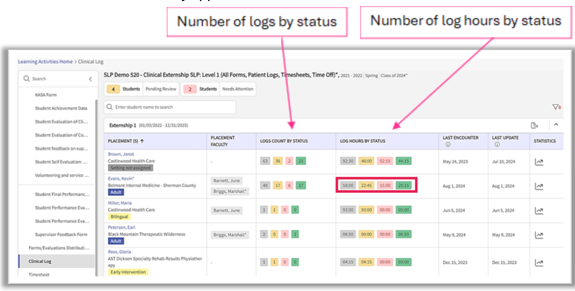 - Needs Attention – The pale red colour option displays the no. of logs and log hours that needs attention for the students.
