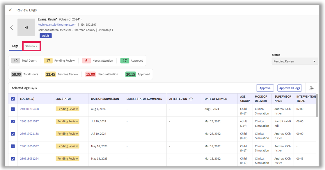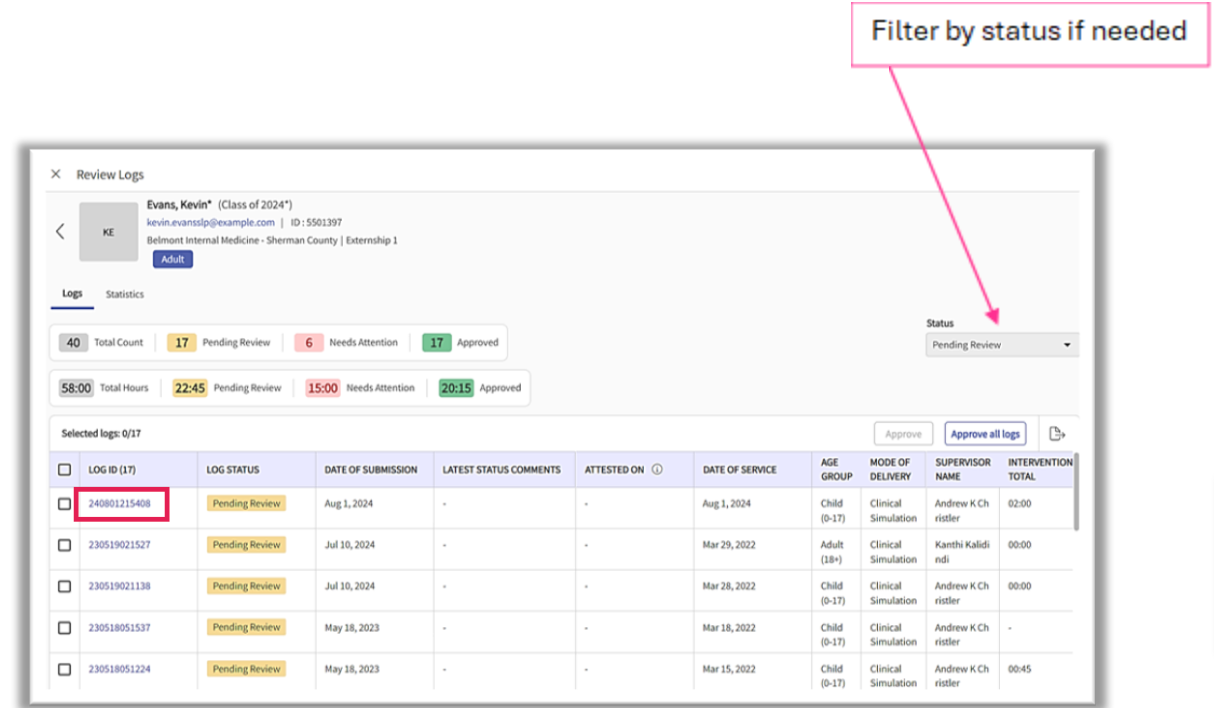 - The system will display all placed students and their current log count by status, current log hours by status. Click on any status or on Pending Review for reviewing.