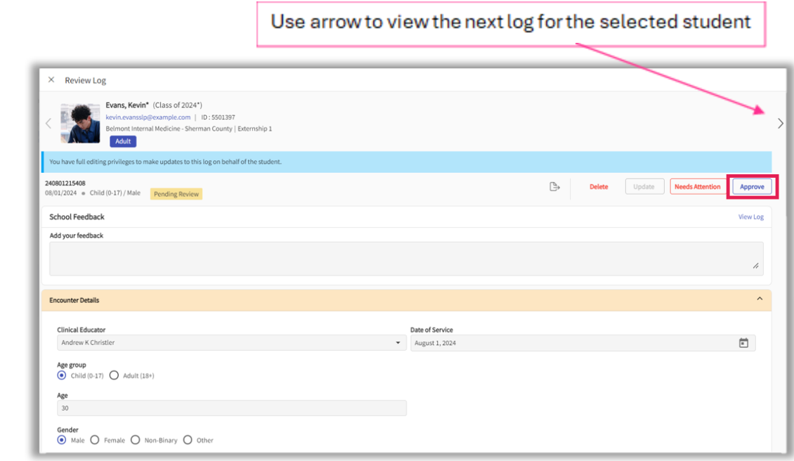 Once your students begin submitting clinical logs, you’ll be able to review their logs and mark any if they need edits.