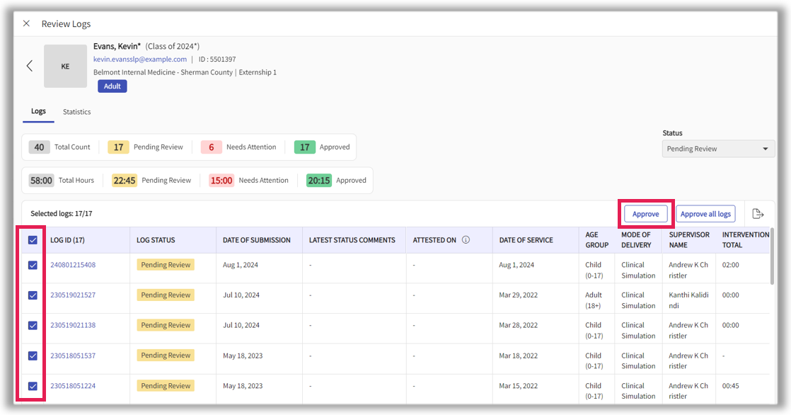 - You can easily approve all logs or multiple logs using the open checkboxes.