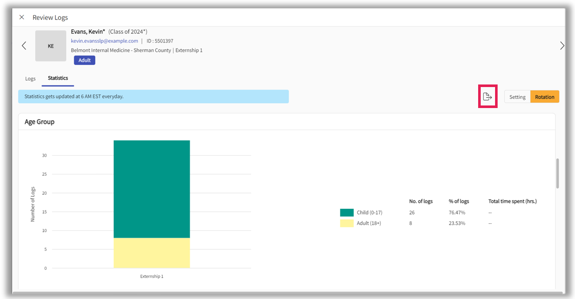 - To view statistics report on the same student, click on Statistics tab on the same page or on the graph icon on the Clinical log main page.