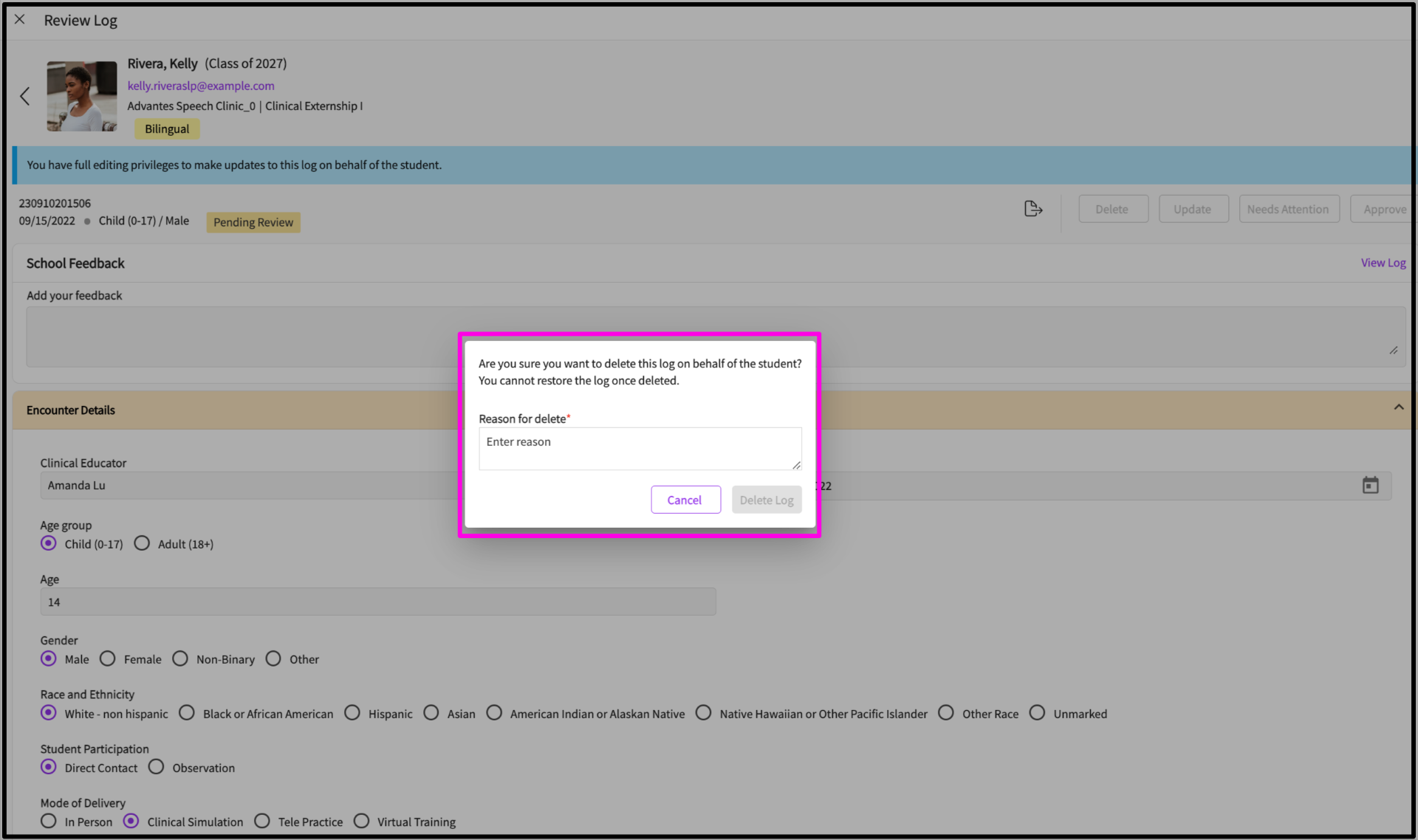 School Administrators can delete patient log during any status ('pending review', 'needs attention', and 'approved' ). Students can delete the log when it is under 'in progress' or 'pending review' status.