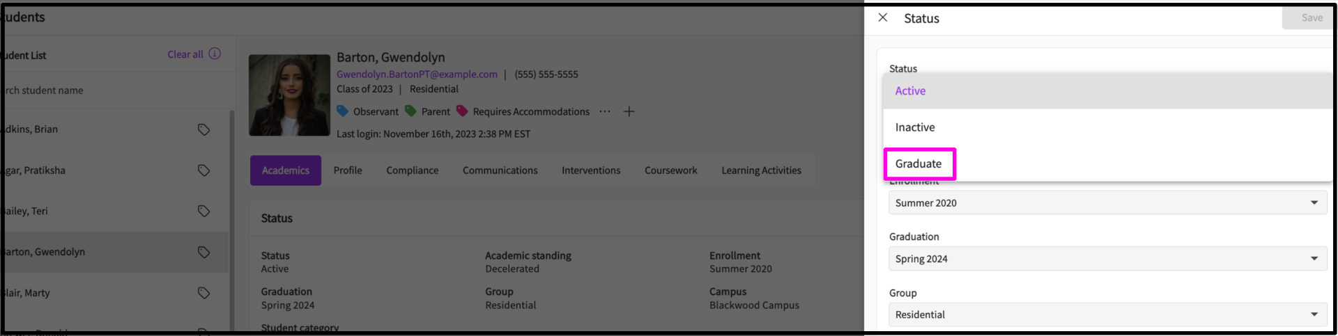 - Marking them as 'Graduate' - This option ensures their name no longer appears in the Students grid by default. However, the student can still have access to Exxat Prism as long as their school email is active