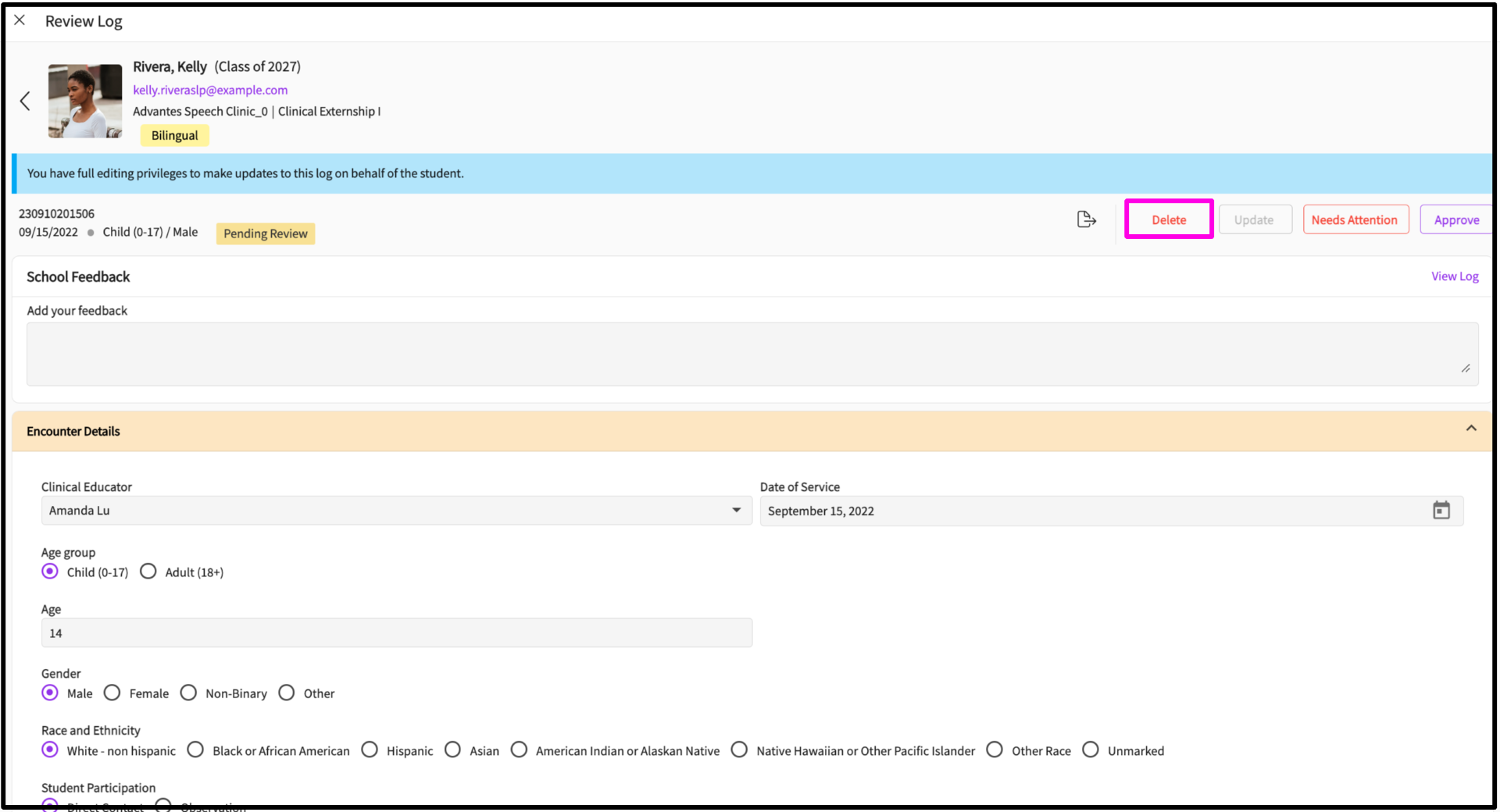 School Administrators can delete patient log during any status ('pending review', 'needs attention', and 'approved' ). Students can delete the log when it is under 'in progress' or 'pending review' status. Please note that the preceptors will have the ability to the logs.