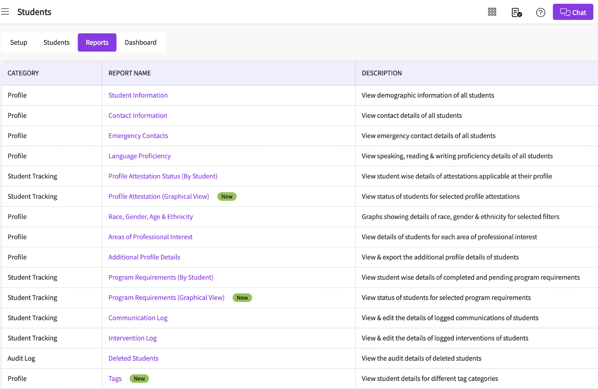 We have introduced three new student reports that give you graphical views of student data. You can easily identify these with the