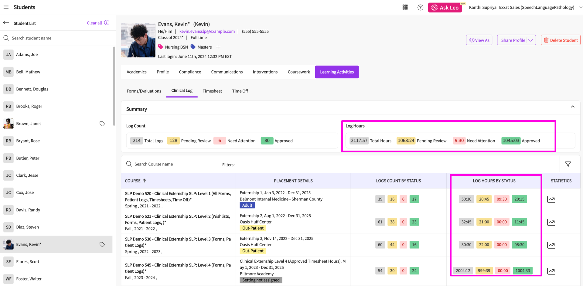 We are excited to announce that you can now see the summary of clinical hours while reviewing logs. Clinical log hours are visible in 4 places for program administrators, 3 places for faculty, and 3 places for students. Below are some examples of pages with this information.
