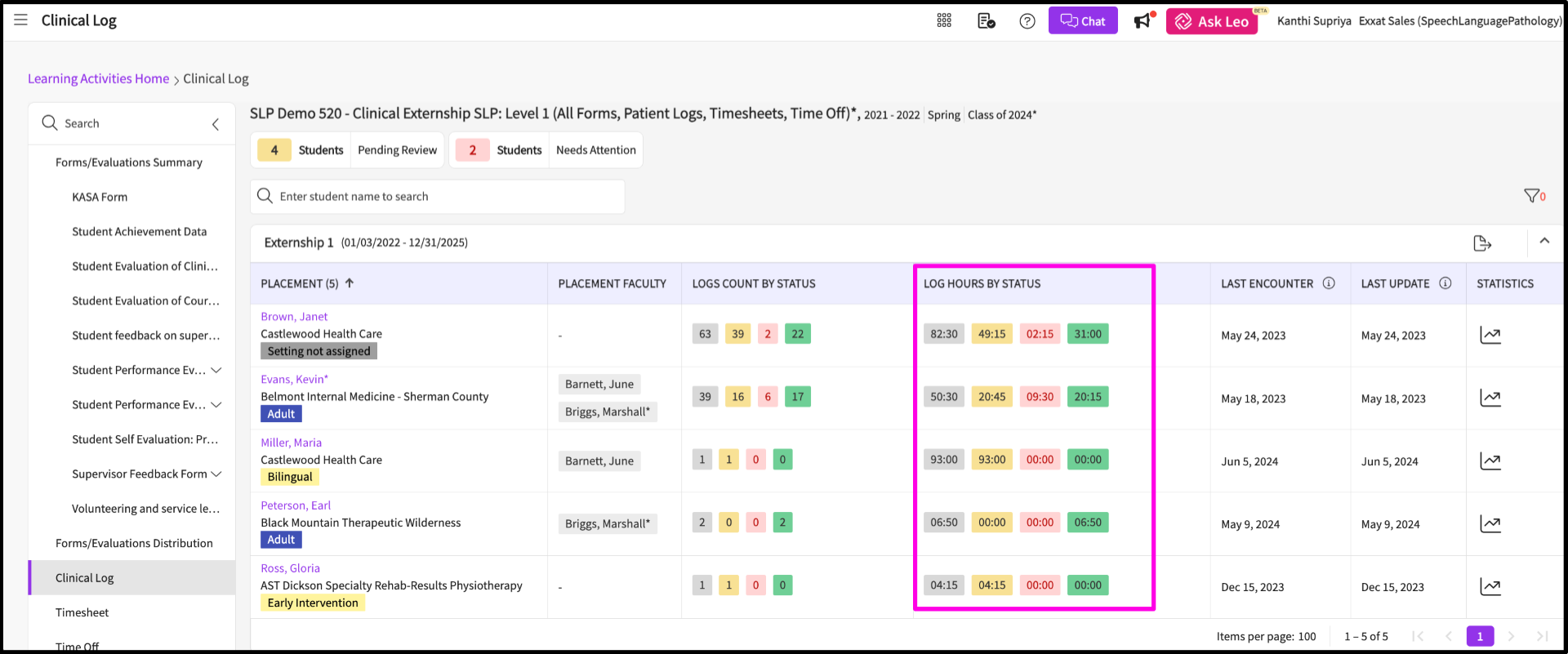Learning Activities > Clinical Log> LOG HOURS BY STATUS column